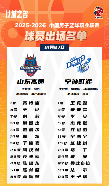 虎扑01月27日讯今日CBA常规赛,宁波对阵山东的大名单已经公布。