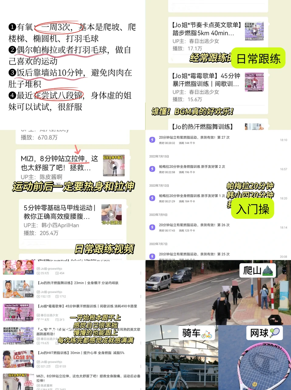 ❶有氧:一周3次,基本是爬坡、爬楼梯、椭圆机、打羽毛球