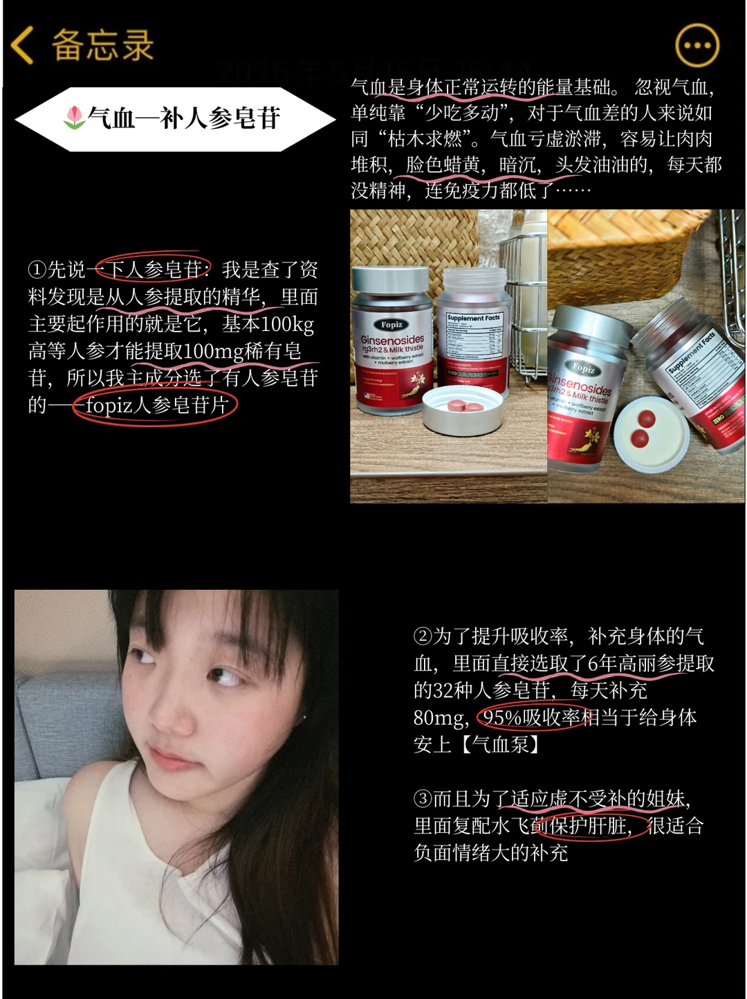 ▪先说一下人参皂苷:我是查了资料发现是从人参提取的精华,里面主要起作用的就是它,基本100kg高等人参才能提取100mg稀有皂苷,所以我主成分选了有人参皂苷的——fopiz人参皂苷片