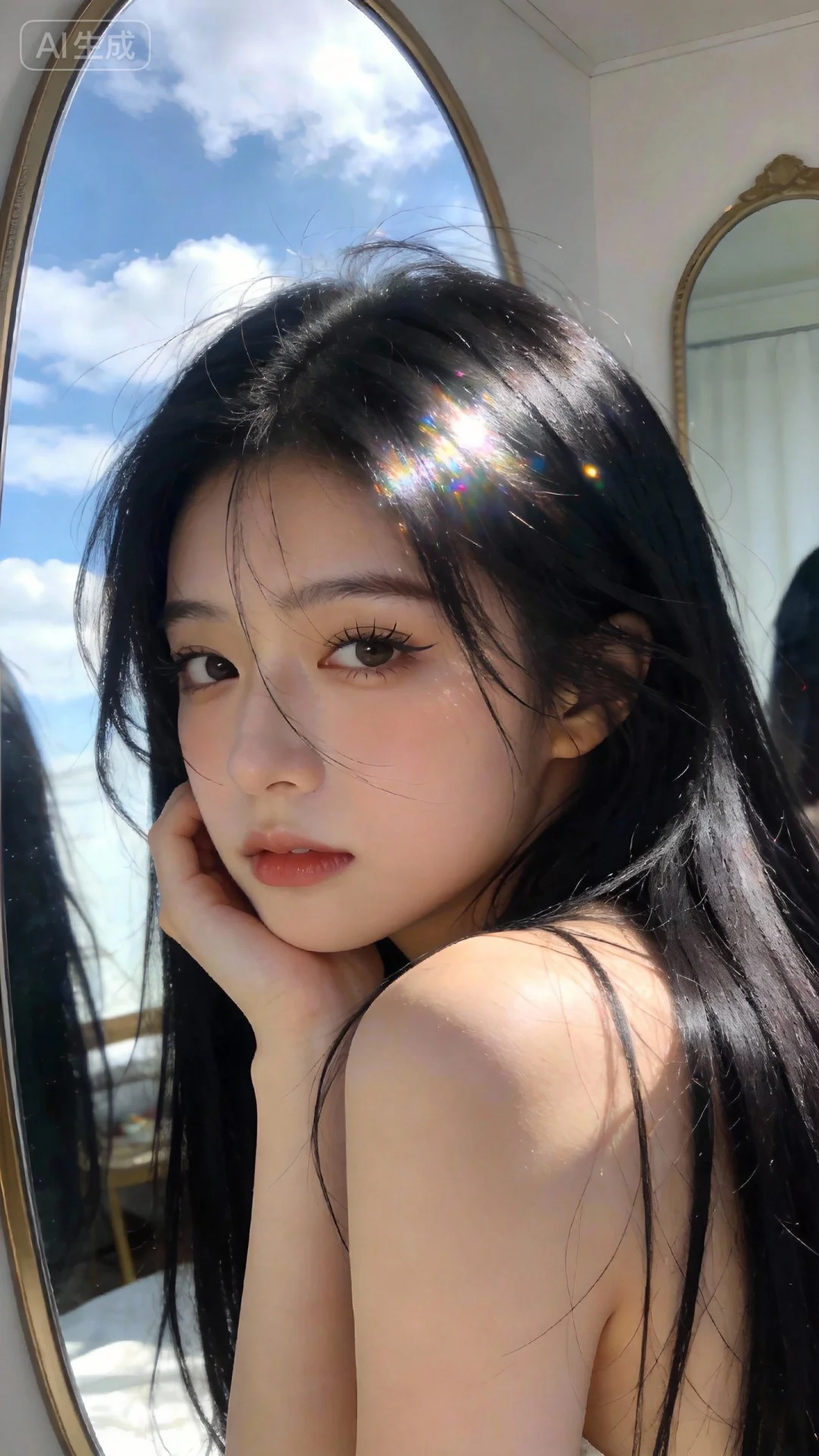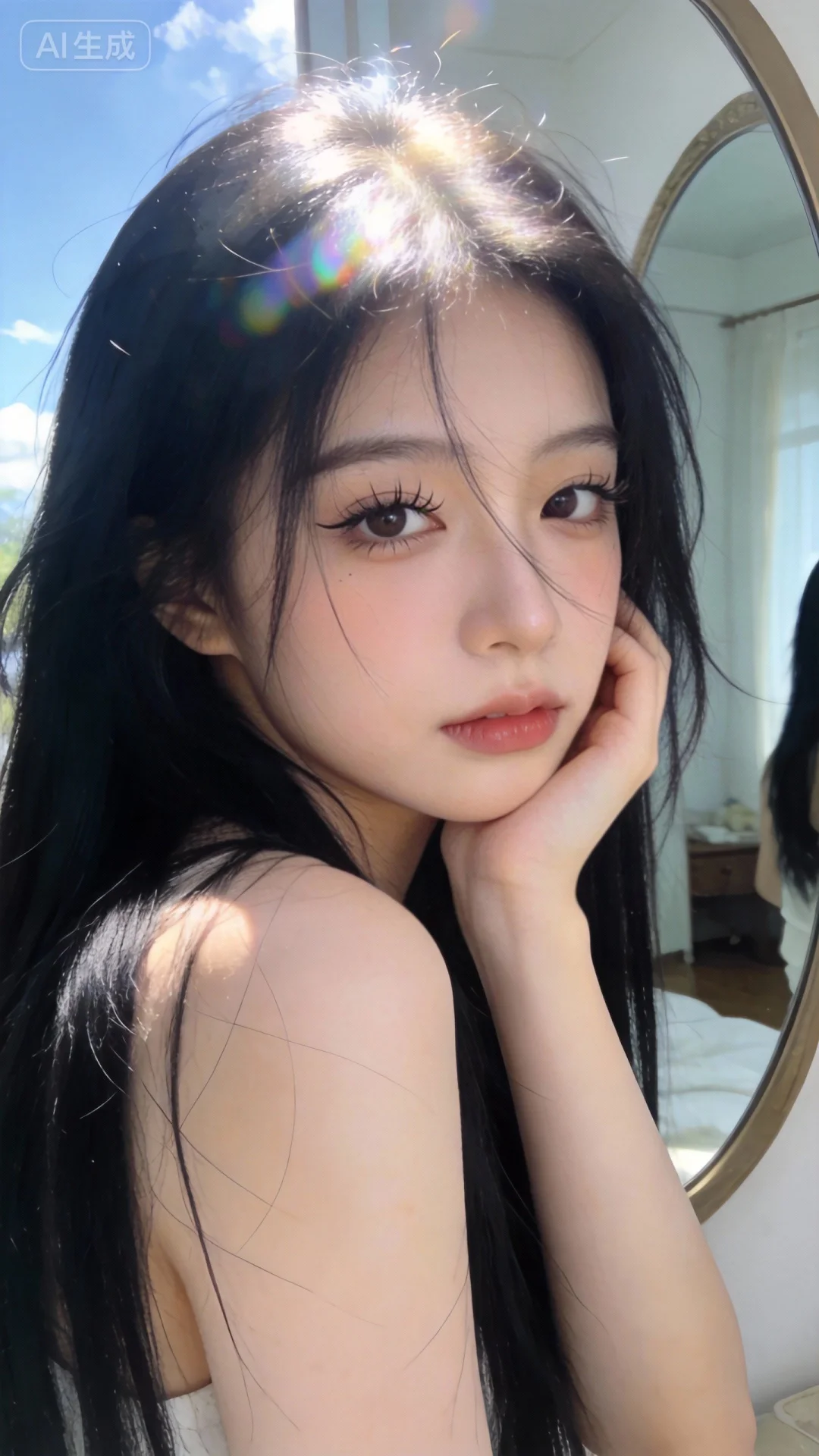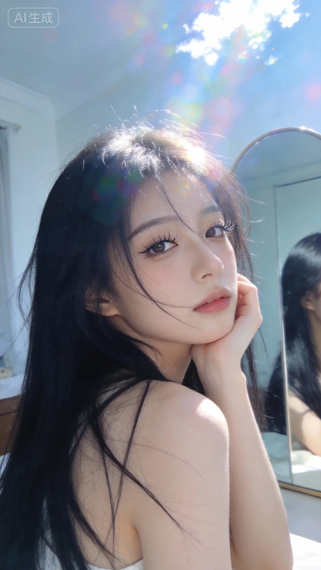 CCD拍摄质感,大师作品级氛围,晴天环境,柔和光线笼罩整体,增添梦幻朦胧感,阳光透过发丝照在脸上以突出自然肌肤状态,回头,镜子,随意抓拍构图(无刻意构图感),呈现生活中绚丽日常的贴近写实感;女生表情自然松弛慵懒,眼神自然不失真(可看镜头或不看镜头),整体神态灵动又不失随性,尽显慵懒悠闲状态;整体为唯美的氛围感情绪片,黑长直,年轻娇小,发丝呈现出自然的蓬松感与垂坠感,长发散落于肩头两侧,几缕发丝拂面,冷白皮气质美女,纯欲风,皮肤白皙,偶像气质,fairskin,且带着忧郁气质的江南美女子,睫毛弯弯,有点甜美,脸部美白透亮表情略带失落,单手托腮陷入沉思,室内房间,特写镜头,忧伤氛围,细腻笔触!