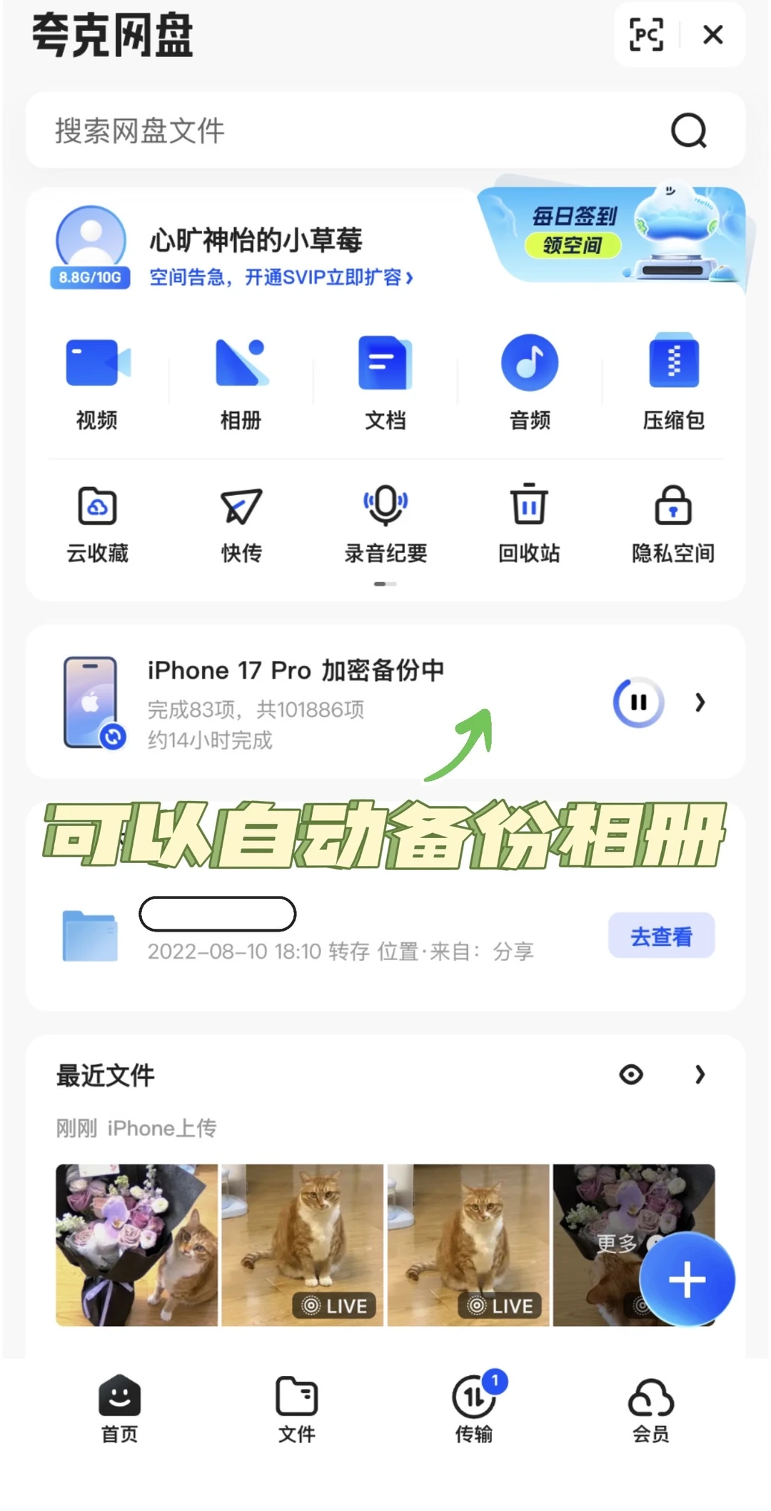 最近发现夸克网盘很好用,可以自动帮忙备份相册里的照片,而且Live图上传后画质不会被压缩,还可以在线播放,甚得我心!