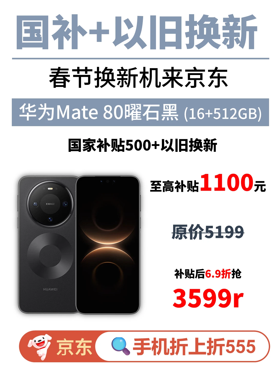 • 华为Mate 80 曜石黑:国补500元+换新补贴1100元,入手价直降,补贴后至低3599