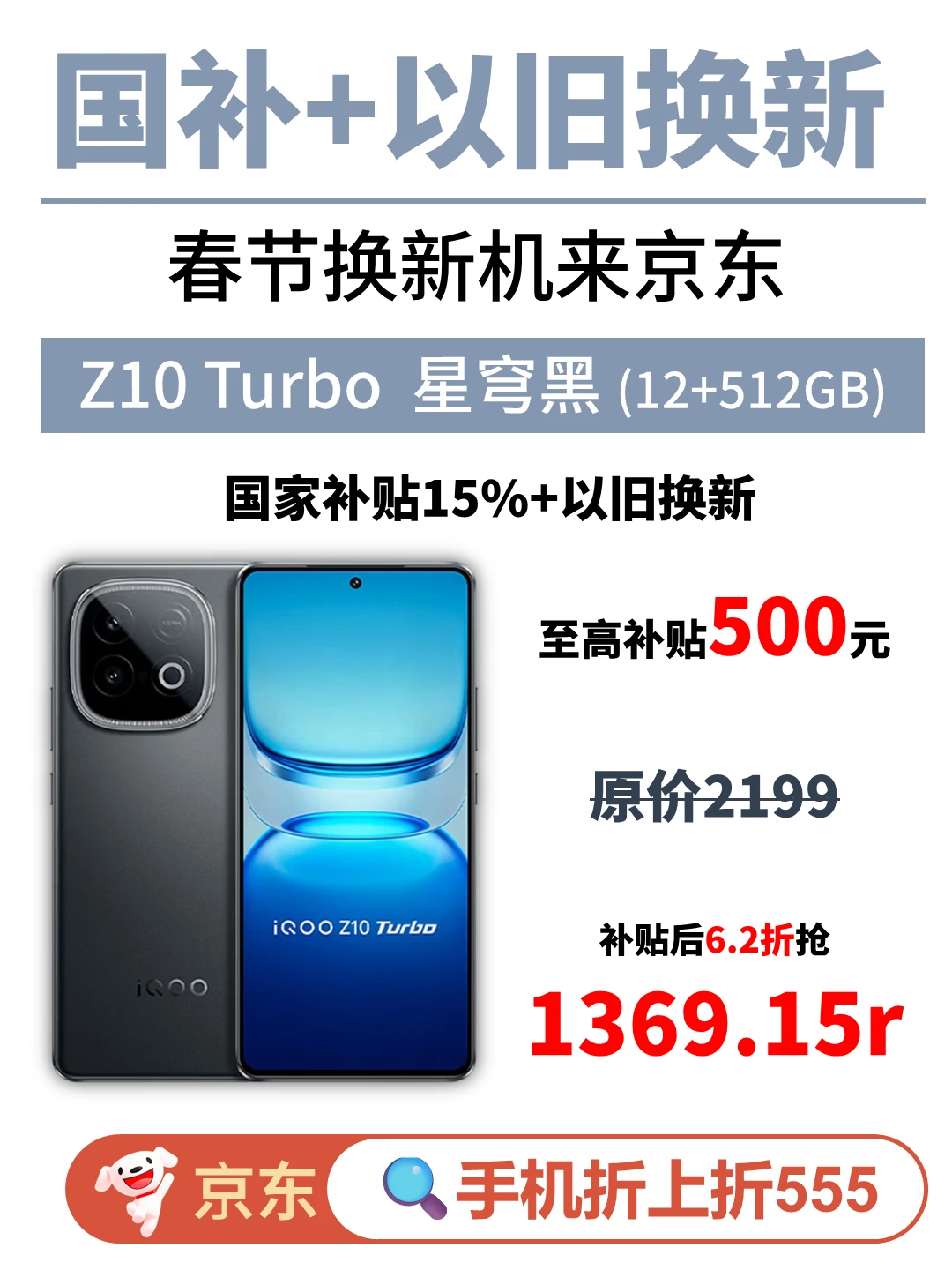 • iQOO Z10 Turbo 12+512G:国补15%还能叠加以旧换新补贴至高500元,补贴后至低1369.15