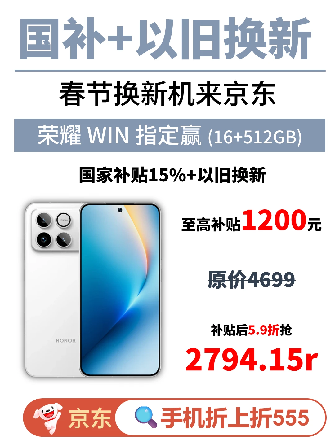 • 荣耀WIN 16+512:国补15%,换新再补1200元,补贴后至低2794.15