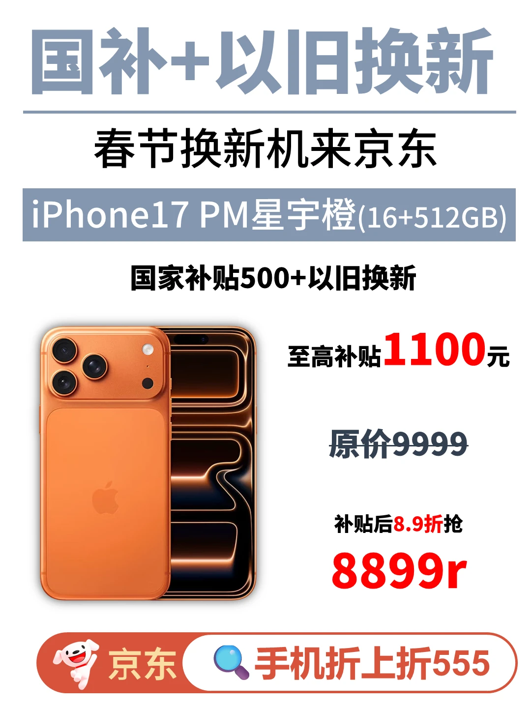 • iPhone 17 Pro Max:享以旧换新至高1100元补贴,补贴后至低8899