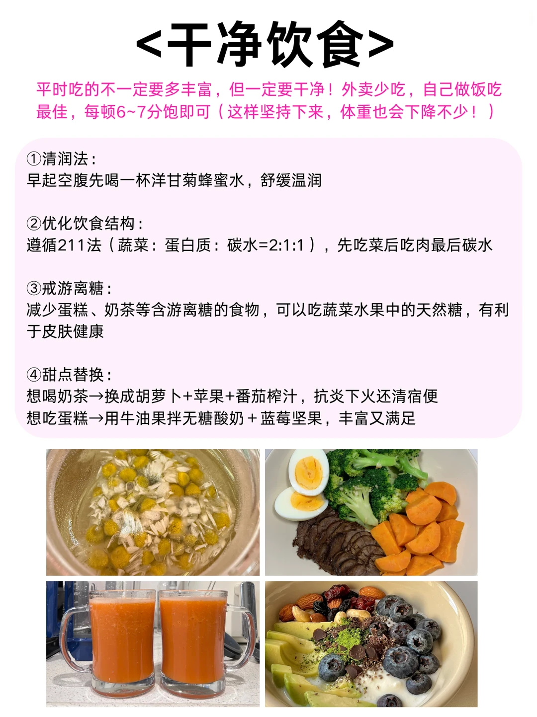 拿我自己说,我一直都知道自己没胆量做y美(真的很怕疼...),但是又想拥有美貌和好身材,所以观察了不少美女,发现她们的皮肤都特别好!而且自己因为生活作息不规律+吃的不干净,皮肤状态一直都很×;做了不少功课,发现还是干净饮食+抗炎最适合我!