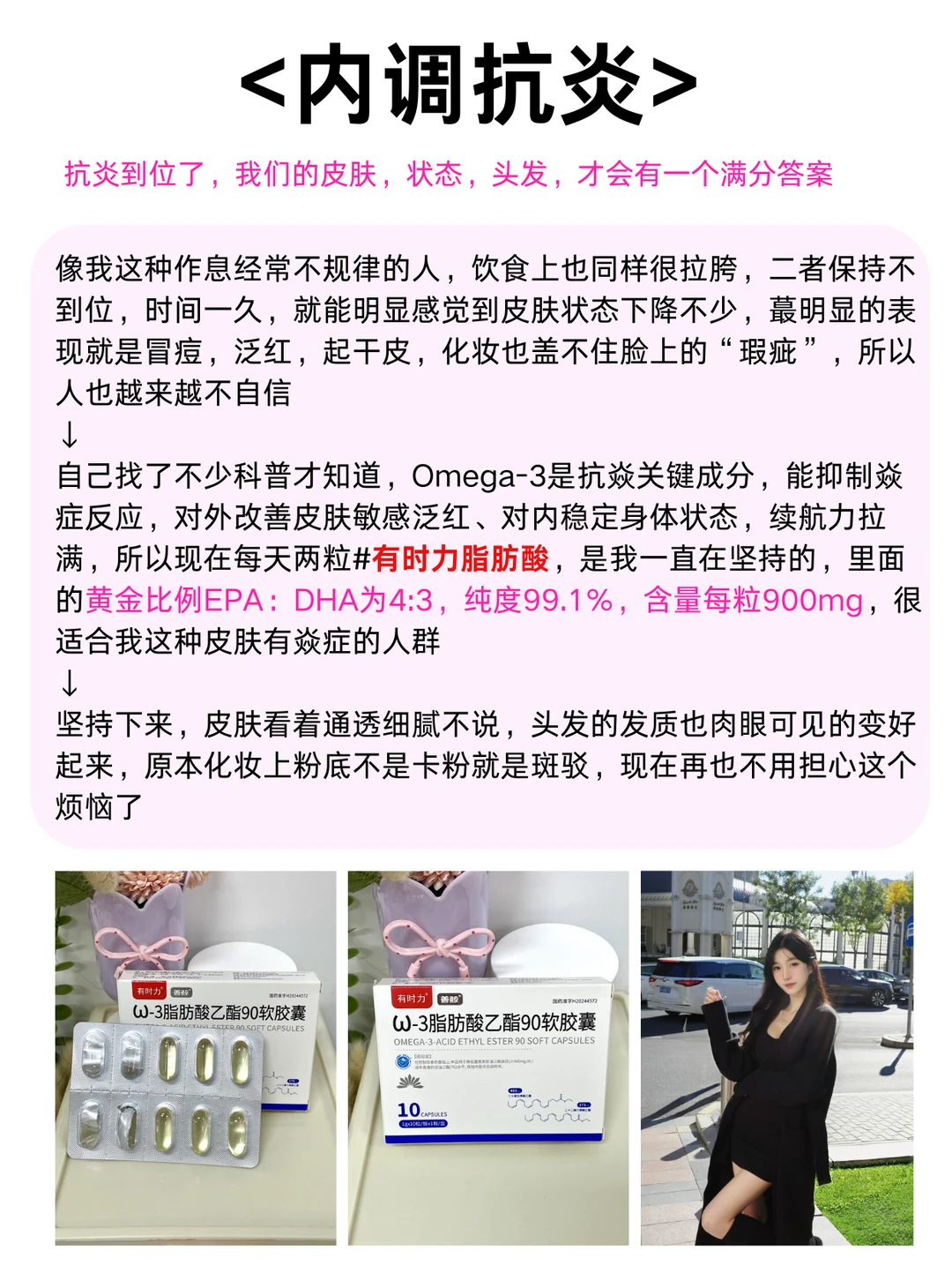 自己找了不少科普才知道,Omega-3是抗焱关键成分,能抑制焱症反应,对外改善皮肤敏感泛红、对内稳定身体状态,续航力拉满,所以现在每天两粒有时力脂肪酸,是我一直在坚持的,里面的黄金比例EPA:DHA为4:3,纯度99.1%,含量每粒900mg,很适合我这种皮肤有焱症的人群