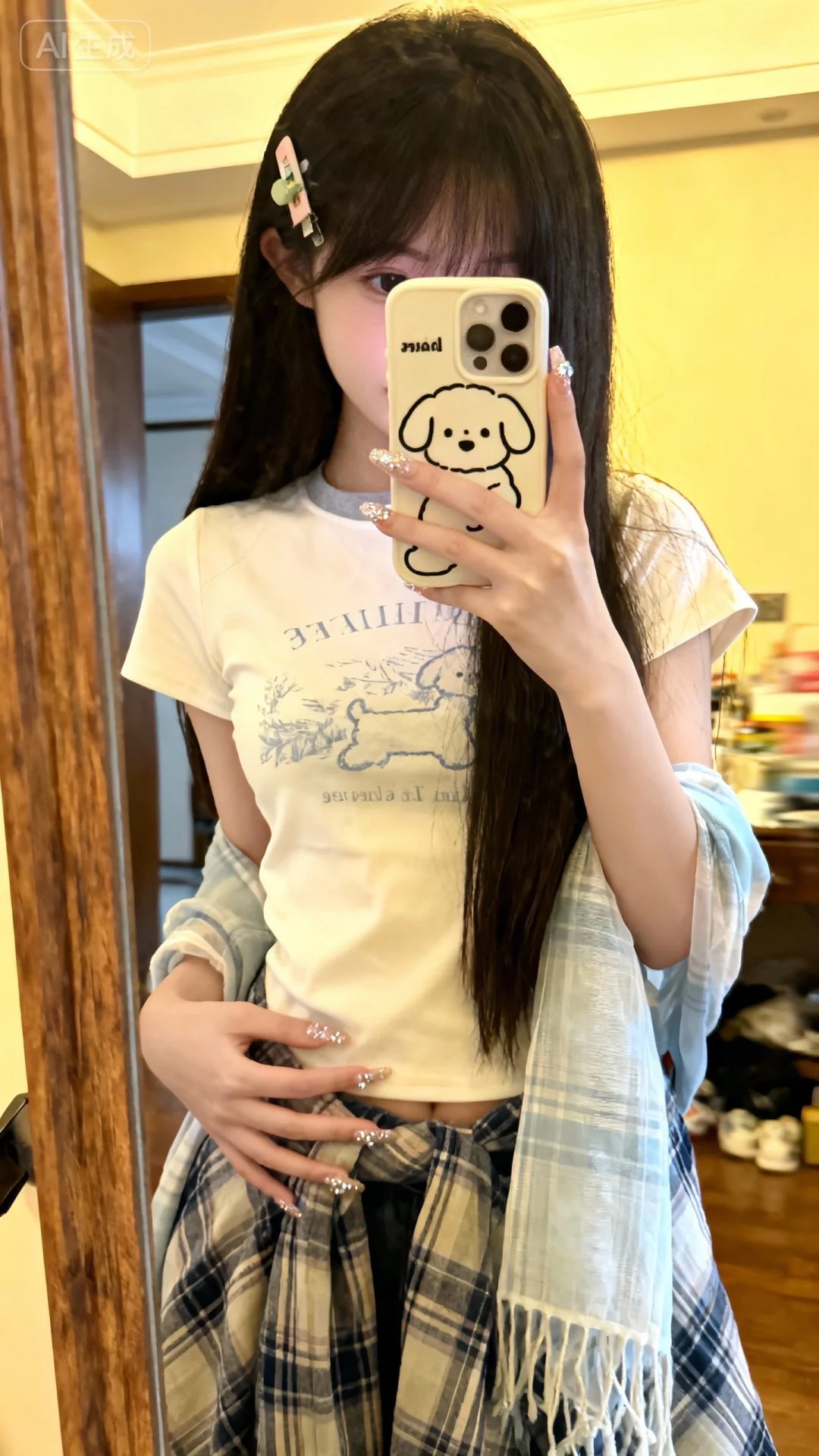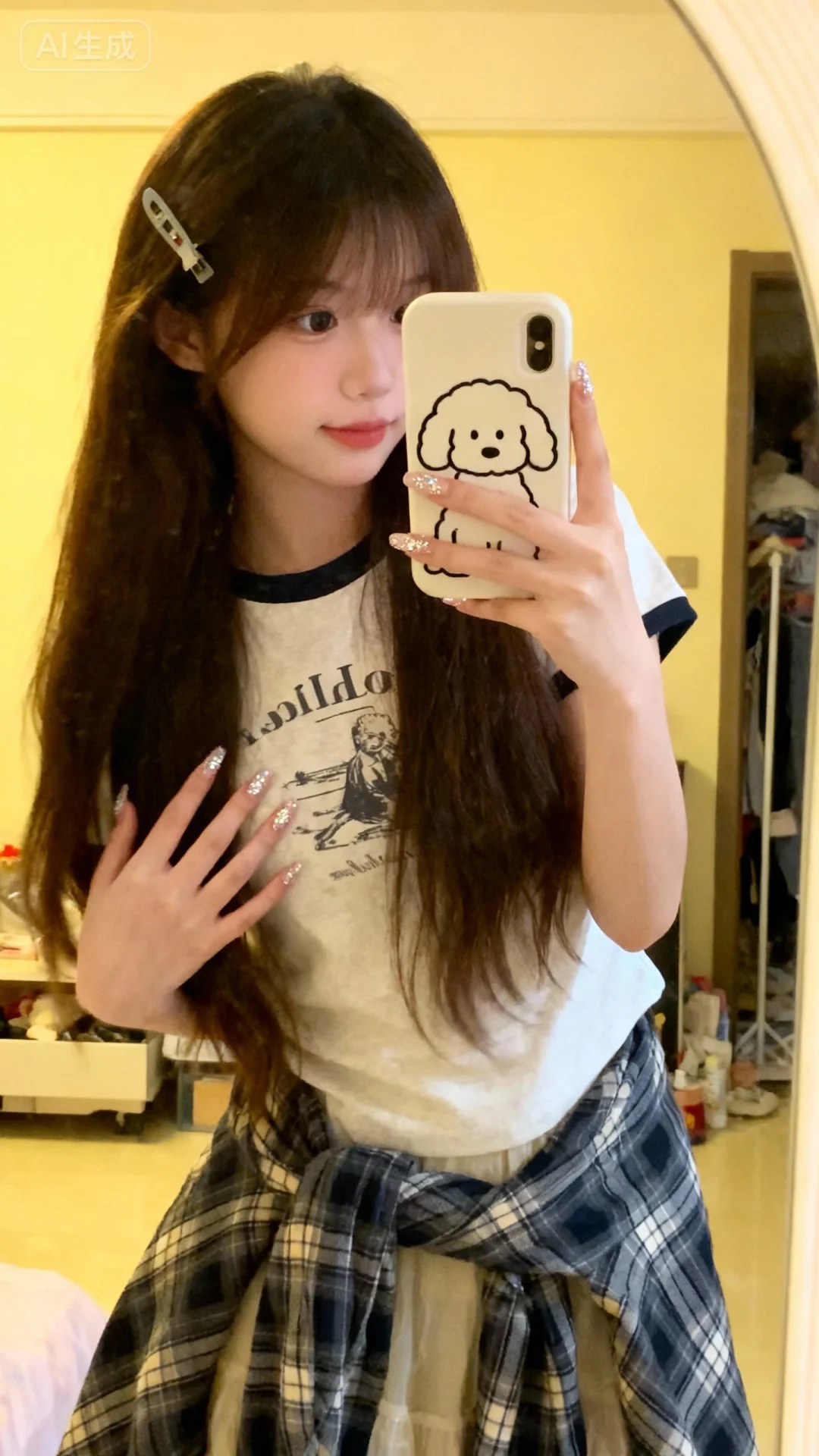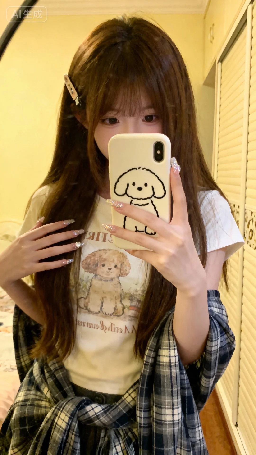 拍摄一张清新写实风格的照片,场景是略显拥挤的房间,落地镜旁有一个长发及腰、如洋娃娃般可爱的女生,头戴卡子,身穿意式T恤和披肩格子衣服,衣服轻薄且层次感强,长美甲在闪光灯下闪耀,手持线条小狗手机壳对镜自拍,画面因快门速度产生运动模糊,采用半身视角,展现女生整体姿态,以暖黄色调营造温馨氛围。