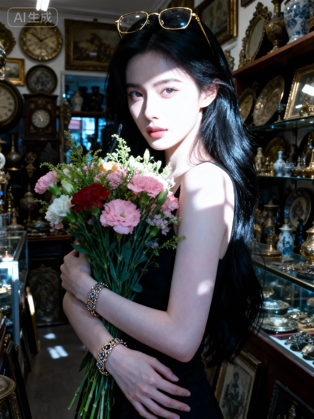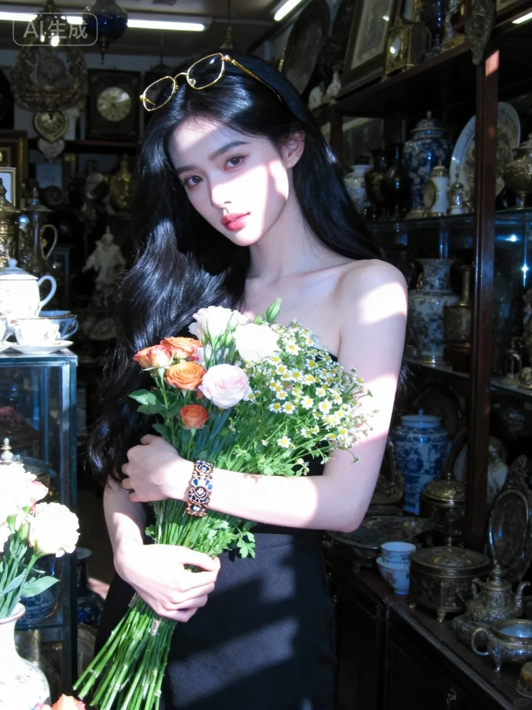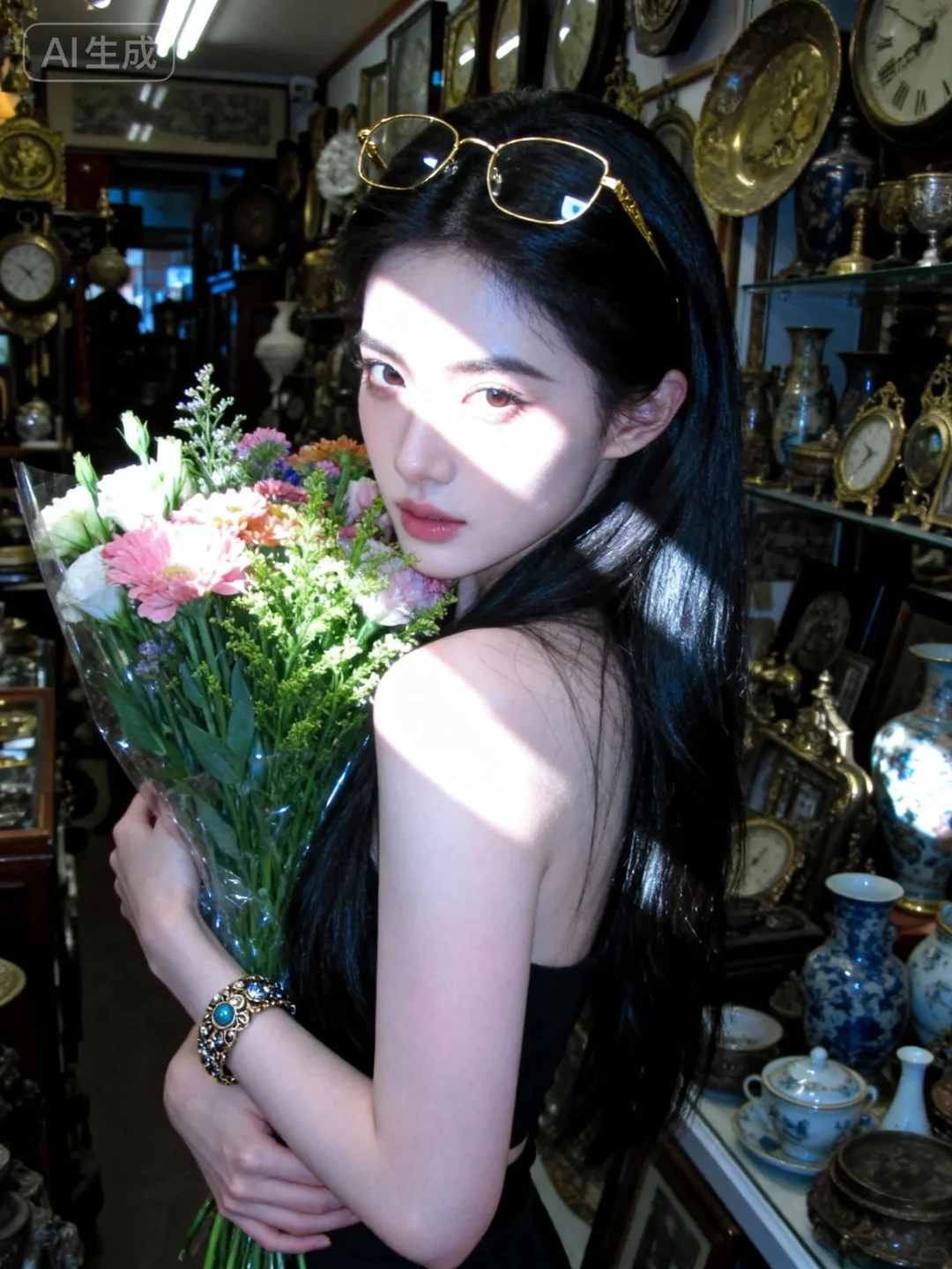 这是一张具有电影质感的写真,采用大师摄影、大师构图和大师光影,以超写实的视觉风格呈现。画面主体是一位超高颜值、神秘又美丽的冷白皮美女,她拥有一头乌黑亮丽的长发,皮肤细腻白皙且粉嫩。她魅力十足,楚楚动人,正抱着一束鲜花,金丝眼镜戴在头上,手上还戴着精致的手镯。场景设定在一家古董店铺内,从低处取景进行全身拍摄,捕捉她的动态美和细微表情。她的侧边有斑驳的阳光光影落在身上,脸部光影更为强烈,营造出一种独特的氛围感。