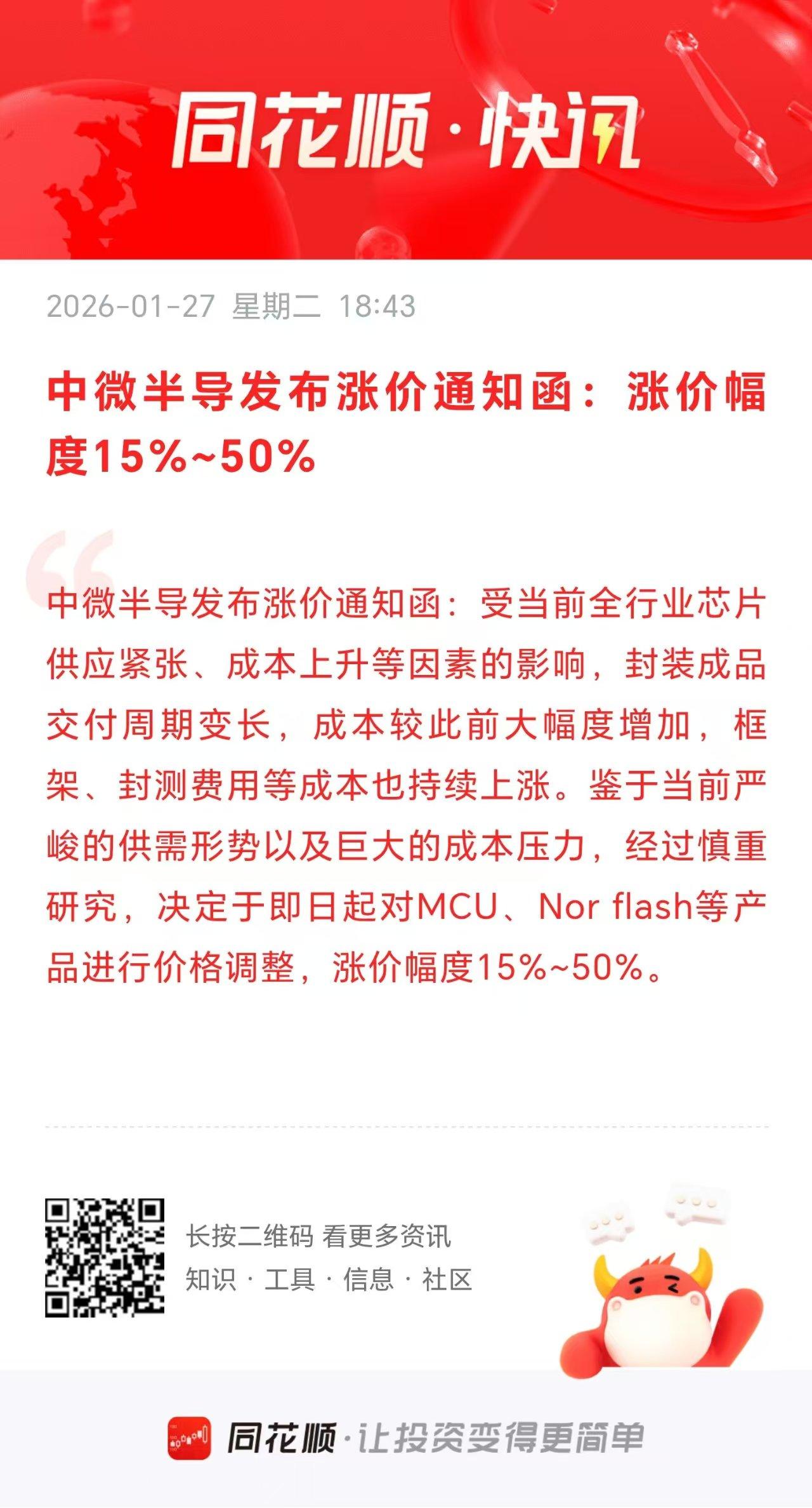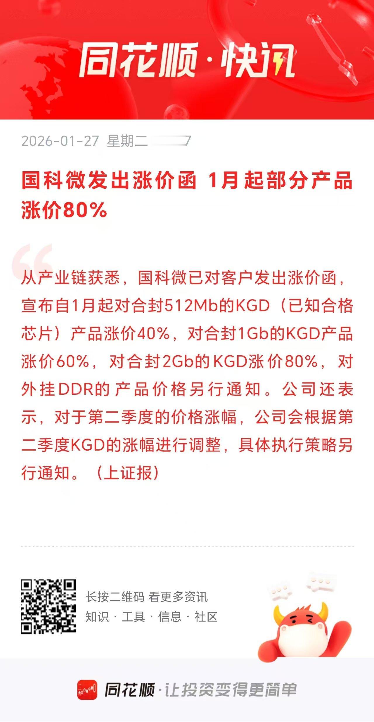 半导体大利好,明天有望延续涨势吗? 刚刚盘后两个半导体公司齐刷刷发布大幅涨价的通知,其中国科微宣布自1月起对合封512Mb的KGD(已知合格芯片)产品涨价40%,对合封1Gb的KGD产品涨价60%,对合封2Gb的KGD涨价80%。 另外,中微半导也发布涨价通知函,决定于即日起对MCU、Norflash等产品进行价格调整,涨价幅度15%~50%。 大家看这个涨价通知,是不是对于半导体板块而言是一个大利好? 两家半导体公司不约而同的发布涨价通知,而且涨幅还不小,这说明了什么? 我想这直接宣示了当前半导体产业链高景气度的现状,特别是存储半导体这一块更是迎来了史无前例的超级周期。 今天大A半导体板块带队反攻,从而顺势带动大盘走强。这也说明了当前的人气所在。 随着盘后这两家半导体公司发布涨价的通知,我想明天半导体大概率有望延续涨势。
