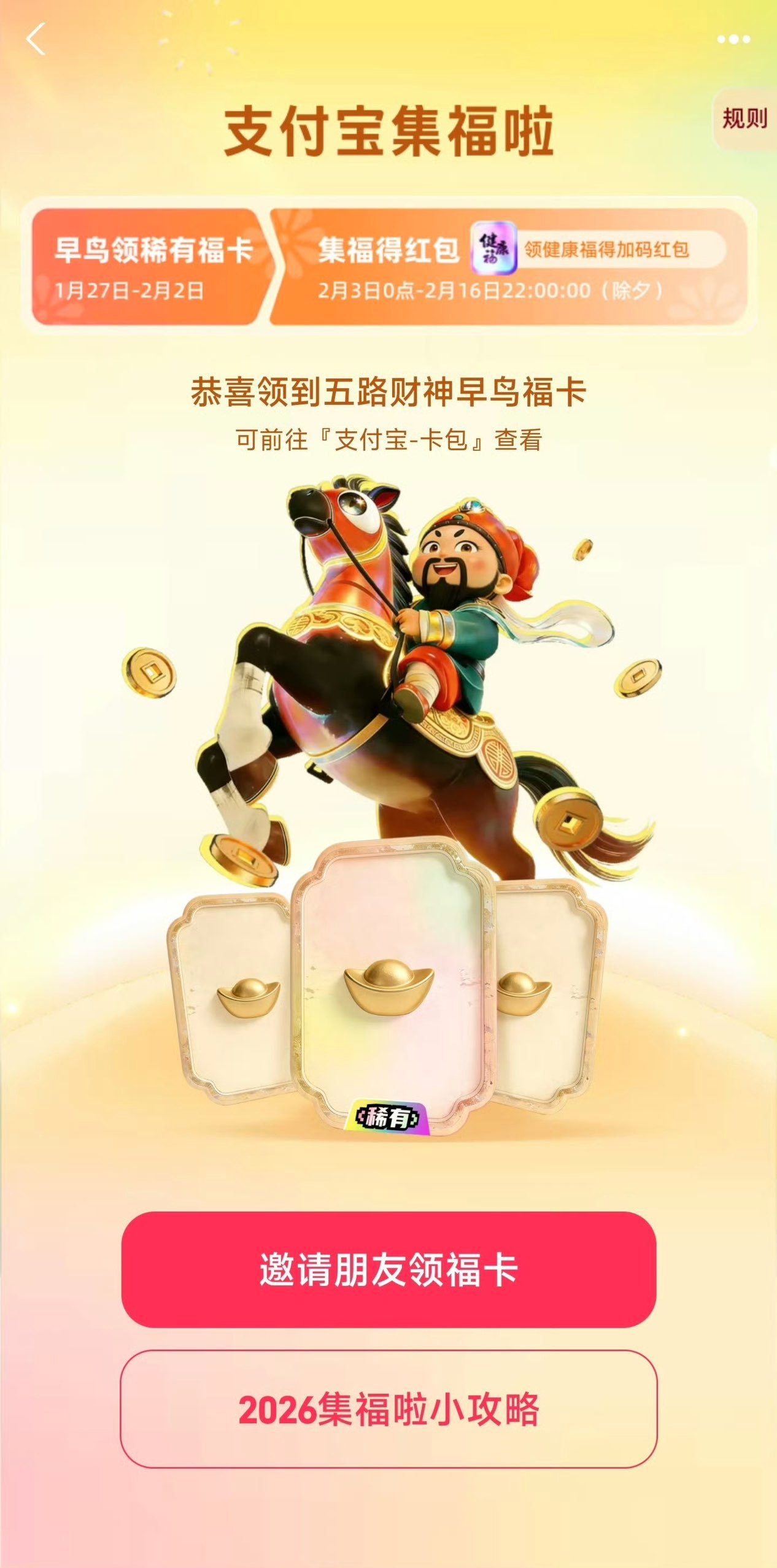 支付宝集五福早鸟卡速领!搜集福直接拿三张,2.3 正式开集没集齐卡就作废,游戏党