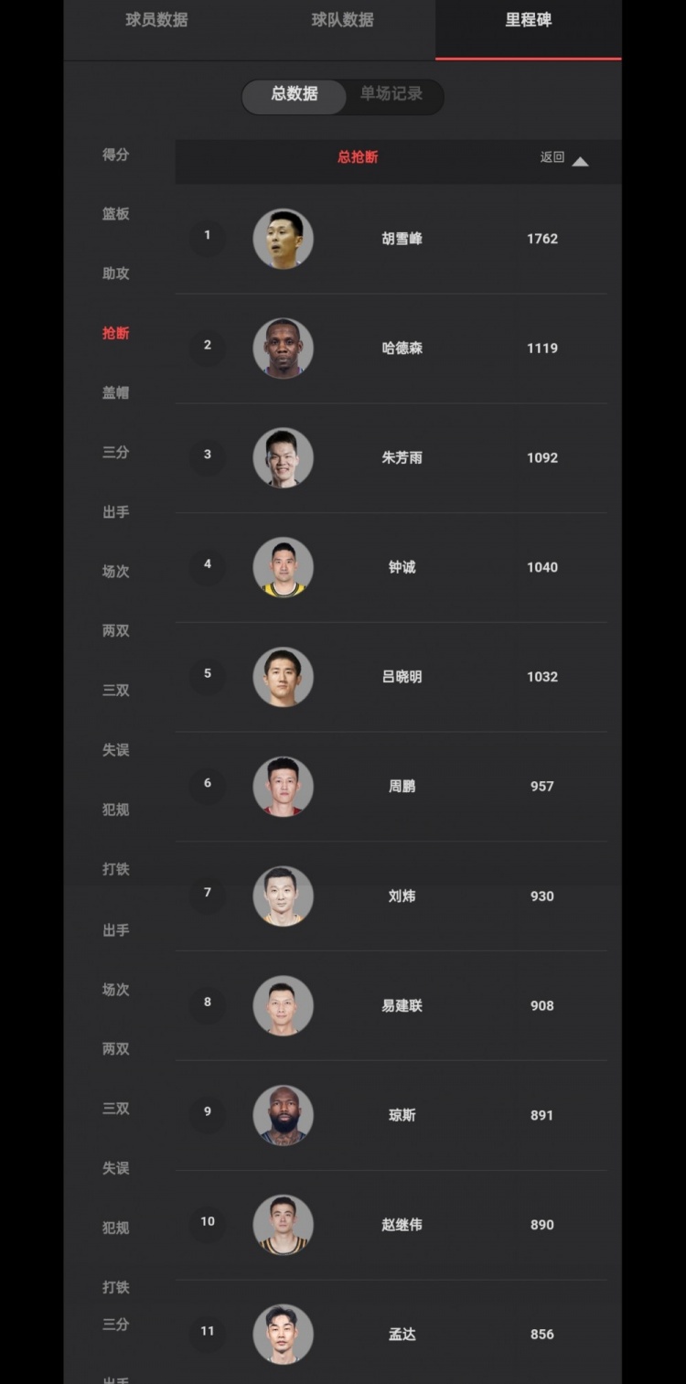 排在他身前的是孙铭徽,他生涯至今送出816次抢断。榜单前11如下: