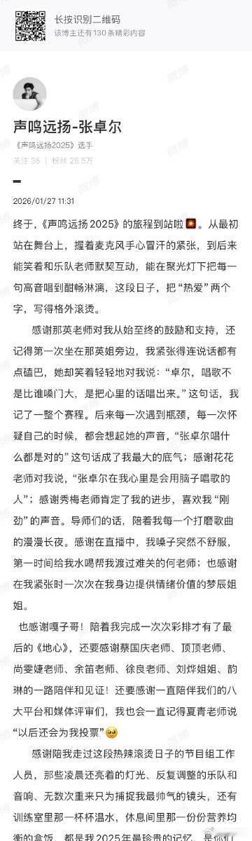 张卓尔发长文声鸣远扬2025的旅程到站啦 一段旅程圆满落幕,张卓尔长文致谢所有陪伴,那英导师的教导是底气,141天坚持超亮眼,未来音乐路更宽🌟
