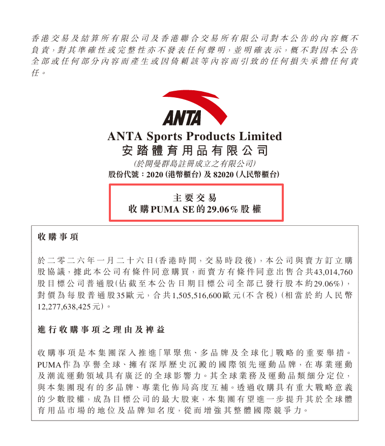 安踏集团表示,此次收购事项是集团深入推进“单聚焦、多品牌、全球化”战略的重要举措。PUMA作为享誉全球、拥有深厚历史的国际领先运动品牌,在专业运动及潮流运动领域具有广泛的全球影响力。其全球业务及运动品类細分定位,与集团现有的多品牌、专业化布局高度互补。