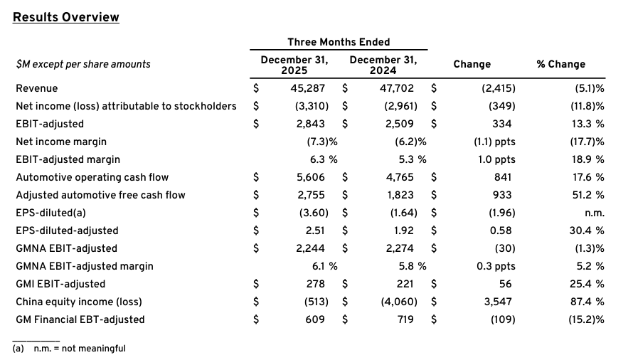 通用汽车在缩减陷入困境的电动车业务时计提了巨额减值,导致2025年第四季度净亏损33.1亿美元。在该汽车制造商本月初表示将计提与电动车相关的额外减值(使其总减值额达到约76亿美元)后,其持续进行的回购计划曾受到质疑。该公司表示预计今年将发生更多实质性减值,但规模将远小于已公布的金额。