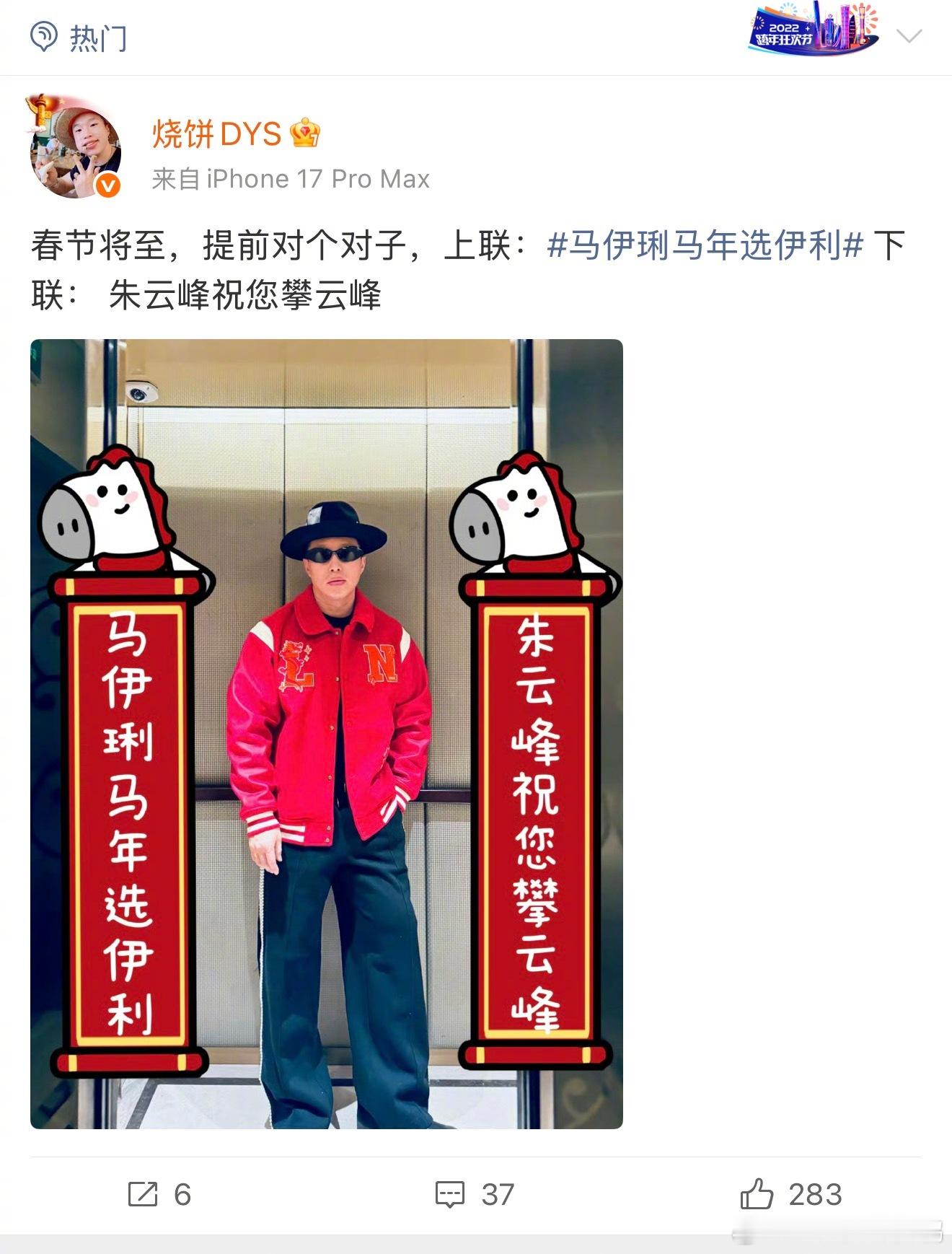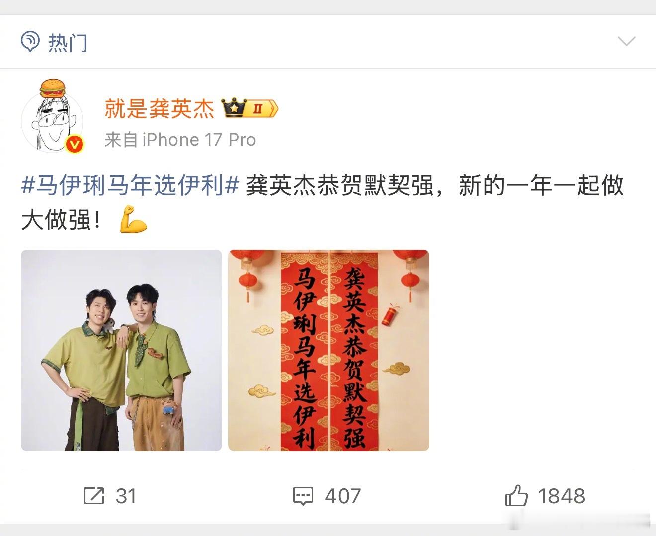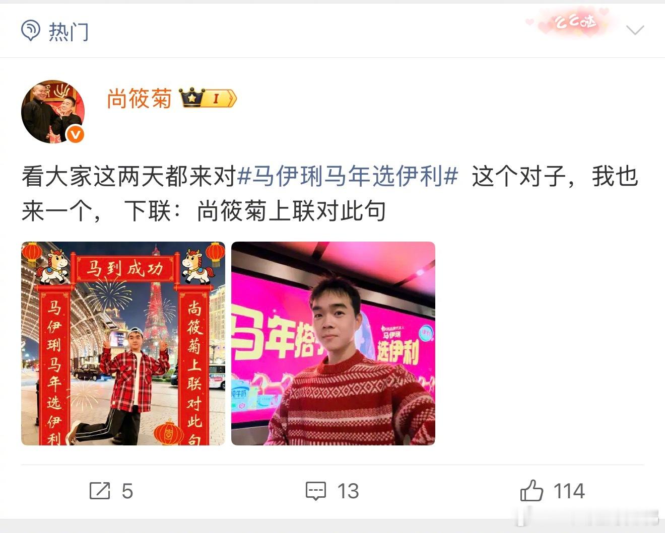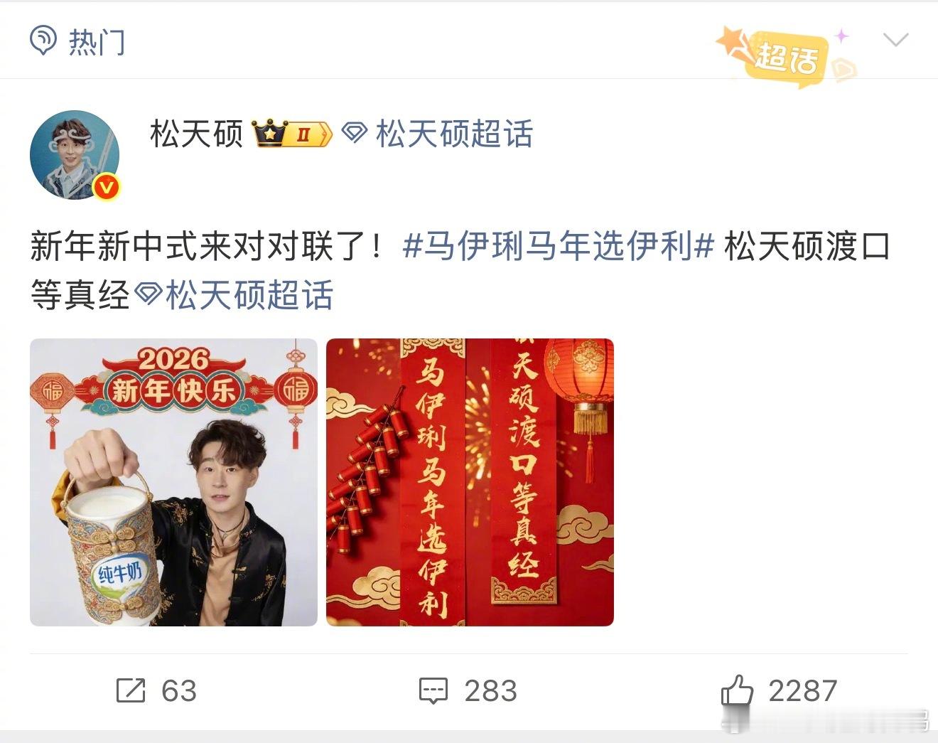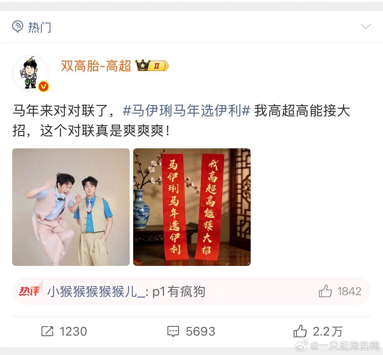 今年的春联来的比往年都要早一些……怎么还没过年就让我看到这么多好笑的梗!上联是马伊琍马年选伊利,你根本不知道下联都能对出些什么五花八门的东西,结果定睛一看,喜人你们怎么都来了?“我高越新年要超越”“我高超高能接大招”“松天硕渡口等真经”“龚英杰恭贺默契强”~~乐子人都开始对对联团建了是吧,那我也速速加入!马年春联卷到乐子人了伊利这个对联炸出来一堆当代文豪