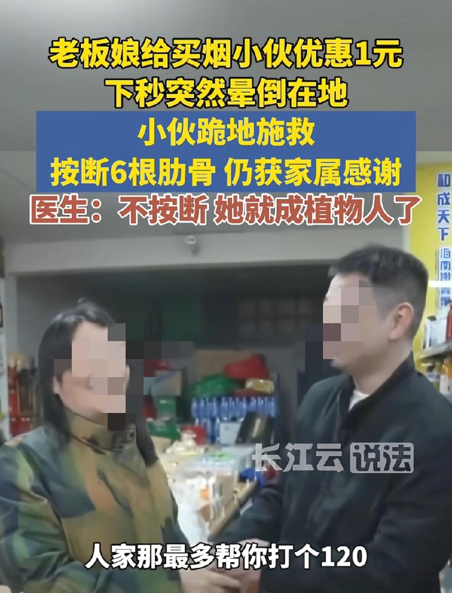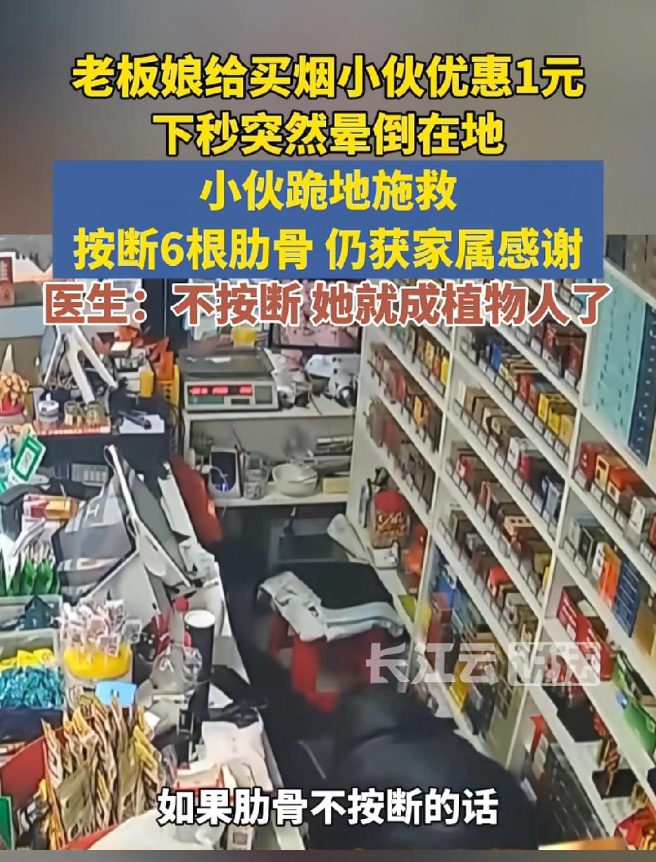 江苏苏州,男子到店购物准备结账,老板娘刚说完为其免1元钱,不料她突然晕倒在地,男子为救人立马实施胸外按压,结果按断老板娘6根肋骨,老板娘家属却称,无此力度或救不回来,这份恩情永远还不完。 老板娘被救活后,想起那天突发晕厥,还好顾客上前胸外按压,自己才转危为安,哪怕断了6根肋骨,她也不怪顾客,反而怀着感恩的心。 说起这件事,老板娘又庆幸又后怕。 老板娘开了一家小商店,男子张某刚好去店内买一条烟。 老板娘笑着跟他说,零头一块钱就免了,给190元就好。 结果这话刚说完,老板娘身子一歪,直接一头栽在地上,人事不省了。 张某当场就慌了,也顾不上付钱的事了,他也不知道老板娘怎么突然晕倒了。 他向店内大喊一声,老板!希望有人过来帮忙看情况。 可惜店内只有老板娘一人。 张某急得呼喊老板娘,可她一点意识都没有,他赶紧拨打120急救电话,把情况说了。 他按照接线员的指令,立马蹲下来,将老板娘平躺在地,做胸外按压,一下下按得特别用力,就想着赶紧把人救回来。 在按接线员的指导下,张某还配合给老板娘做了人工呼吸,光按压就足足做了600次。直到救护车到来。 到了医院一检查,老板娘是突发晕厥,万幸的是送医及时、抢救到位,人总算救回来了,就是检查出肋骨断了6根。 医生说就是胸外按压的过程中压断的。 家里人赶到医院,一听这情况,并没有责怪张某。 他们心里别提多感激这位大哥了,直说要是当时大哥按压的力度没这么大,说不定人就救不回来了。 几根肋骨断了能治好,命要是没了就啥都没了,这份救命的恩情,他们这辈子都还不完。 后来老板娘醒过来,她知道自己是被张某顾客救了,虽说断了6根肋骨,养伤得遭一阵子罪,但她半点儿都不怪人家,反倒满心都是感激,总说自己遇上了好人,要是没人敢伸手帮忙,后果不堪设想。 现在说起这事,老板娘还是后怕,当时要是再晚几分钟,或者没人懂急救,那后果真不敢想。 而挺身而出的张某,也因这次勇敢救人的行为,被认定为见义勇为。 有网友担心,救人致伤要不要担责?万一家属讹上了怎么办? 《民法典》第184条规定,自愿实施紧急救助行为造成受助人损害的,救助人不承担民事责任。 专业人士也表示,胸外按压本身就存在肋骨骨折的常见并发症,即便专业医护人员操作也难以避免,在生死一线的紧急时刻,挽救生命是第一要义,法律绝不会让见义勇为者“流血又流泪”。 有网友说:一方敢舍身相救,一方懂感恩包容,双向的善意太暖心了,这才是最美好的模样!法律为好人撑腰,大家救人才更有底气,再也不用怕好心办‘坏事’了! ​ 还有网友表示:这起事件就是最好的例子,生命至上,善意无价,愿每个挺身而出的好人,都能被温柔以待。 法律为好人兜底,社会为善意喝彩,才能让更多人在他人危难时,敢于伸出援手。 对此你怎么看?