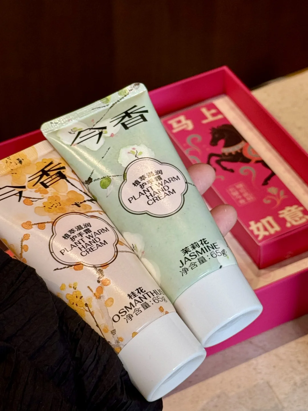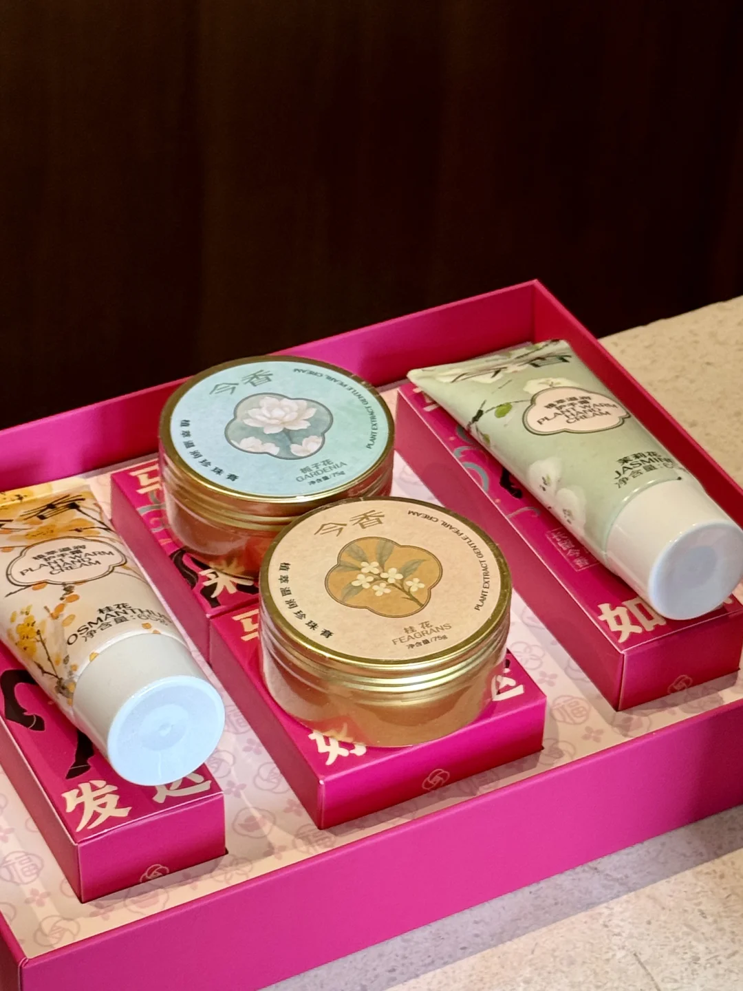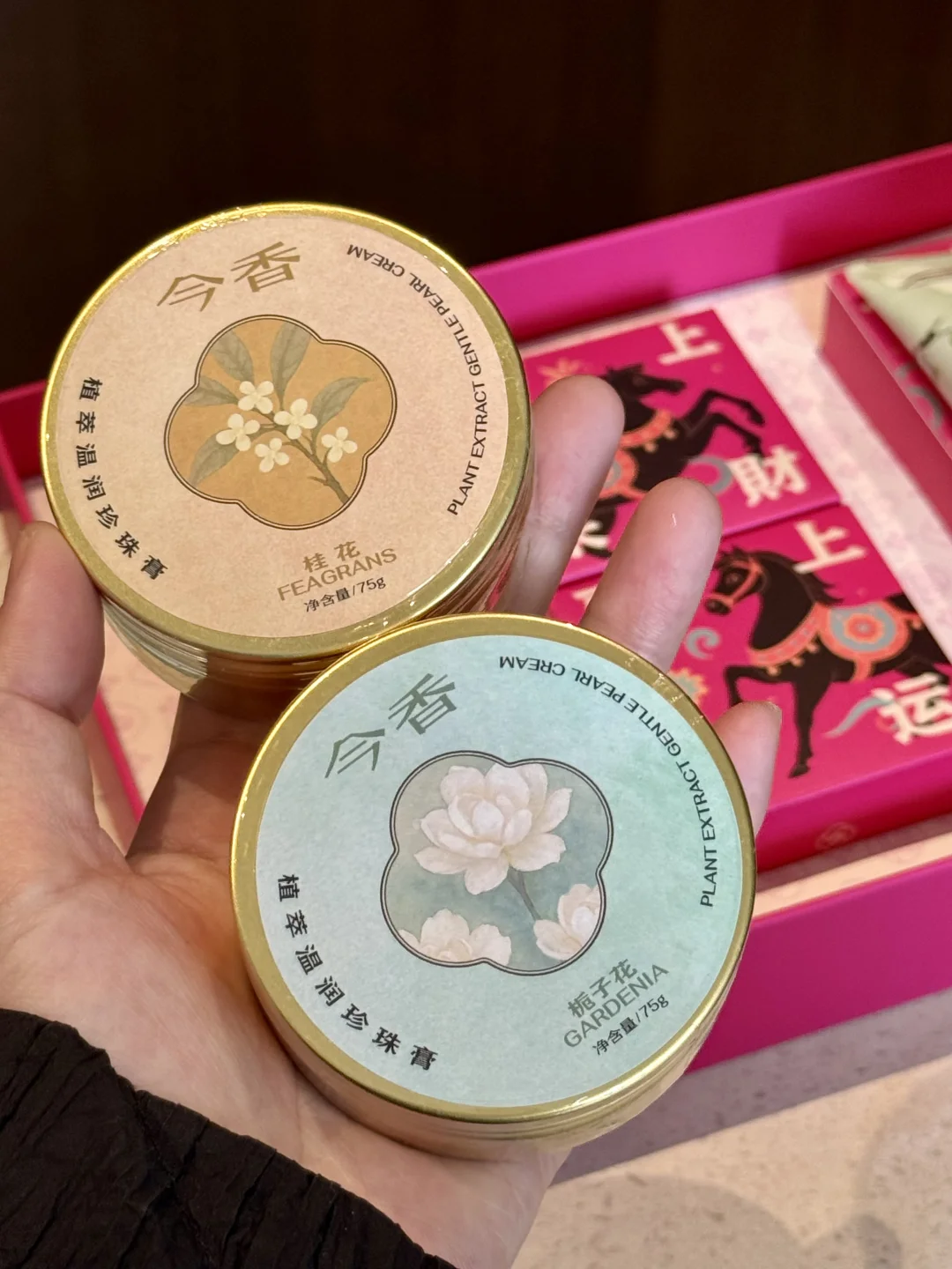 可以说是上海伴手礼天花板了! 礼盒装设计怪好看的 马年送再适合不过啦 我对雪花膏的记忆还停留在小时候 没想到今香这款国货直接变身时髦又实用的新年礼 现在长大了居然还能当礼物送长辈! 里面有珍珠膏(栀子花、桂花)跟护手霜(桂花、茉莉) 珍珠膏跟护手霜的香味都是植物萃取 全家人都可以用 温润细腻,吸收快不粘腻,秋冬涂脸护手都适配 之前用过的很多保湿效果都没有这么好! 真正做到不挑人!怎么送都不会踩雷!