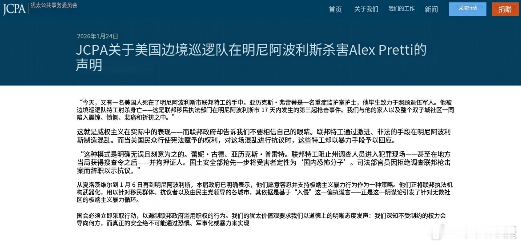 美国犹太公共事务委员会对美国边境巡逻队(ICE)在明尼阿波利斯杀害亚历克斯·普雷