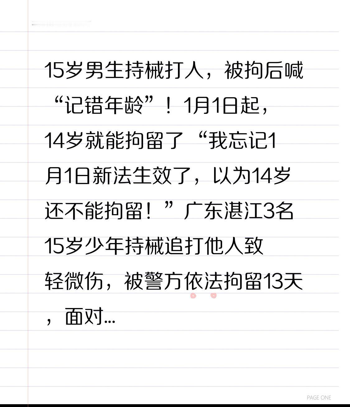 15岁男生持械打人,被拘后喊“记错年龄”!1月1日起,14岁就能拘留了 “我忘记1月1日新法生效了,以为14岁还不能拘留!”广东湛江3名15岁少年持械追打他人致轻微伤,被警方依法拘留13天,面对镜头说出的这句话,直接炸穿热搜!这起2026年新法落地后的首例未成年人拘留案,彻底击碎了“未成年=免罚”的侥幸心理。 事情要从1月3日凌晨说起。李某、吴某、彭某三名15岁少年,因琐事对16岁的苏某和韦某心存不满,驾驶电动车故意撞倒对方后,掏出器械追打两人,导致受害人身上多处擦伤、软组织损伤,构成轻微伤。案发当天晚上,警方就将三人抓获,面对铁证,他们对寻衅滋事的行为供认不讳。 可让人啼笑皆非的是,被抓后一名少年还在辩解:“朋友说第一次违法不会拘留,第二次才会,没想到这次直接进来了”。另一名少年彭某更是直言,自己压根忘了1月1日新修订的《治安管理处罚法》已经施行,以为14岁还是“安全线”。殊不知,他们的行为早已触碰了新法的红线——持械伤人、扰乱公共秩序,属于情节严重、影响恶劣的情形,即便未满16周岁,也能依法执行拘留。 这正是新法最关键的变化!以前旧法规定,14至16周岁未成年人违法一律不执行拘留,导致不少孩子把年龄当“护身符”,肆意妄为。而2026年1月1日起施行的新法,直接打破了“一刀切”:14至16周岁未成年人,只要违法情节严重、影响恶劣,或者一年内两次以上违法,都能执行行政拘留;16至18周岁初次违法但情节恶劣的,也不例外。湛江这三名少年,刚好撞上了新法落地后的“首单”,成了最鲜活的普法案例。 但反转来了:拘留不是目的,教育才是根本。警方在对三人执行13天行政拘留后,并没有一放了之,而是将他们送入专门学校接受矫治教育,通过心理辅导、法治课程、行为矫正等系统化干预,帮他们树立正确的价值观。这种“惩戒+教育”的模式,既让孩子们尝到了违法的苦果,又给了他们改过自新的机会,真正体现了“宽容不纵容”的立法精神。 其实类似的案例不止一起。四川达州15岁少年小明,2025年因盗窃、殴打他人未被执行拘留,2026年1月再次打人,因一年内两次违法,被警方依据新法拘留;内蒙古五原县4名14岁少年霸凌他人,也同样被行政拘留。这些案例都在传递一个信号:法律对未成年人的保护,从来不是无底线的纵容,年龄再也不是违法犯罪的“挡箭牌”。 如今,越来越多的未成年人违法案件,都源于对法律的无知和侥幸心理。家长以为“孩子还小”,学校法治教育不到位,社会上的错误传言误导,最终让孩子一步步走向歧途。新法的落地,不仅是给未成年人划定了行为边界,更是给家长和学校敲响了警钟:一定要让孩子从小敬畏法律,知道什么能做、什么不能做。 每个孩子的成长都需要引导,法律的威严不是为了惩罚,而是为了守护。湛江这三名少年的经历,希望能给所有未成年人提个醒:法律不会因为年龄小就网开一面,心存侥幸终将付出代价。也愿每个家长都能重视法治教育,让孩子在规则的框架内健康成长。 你觉得新法对未成年人的处罚力度合适吗?评论区聊聊你的看法~