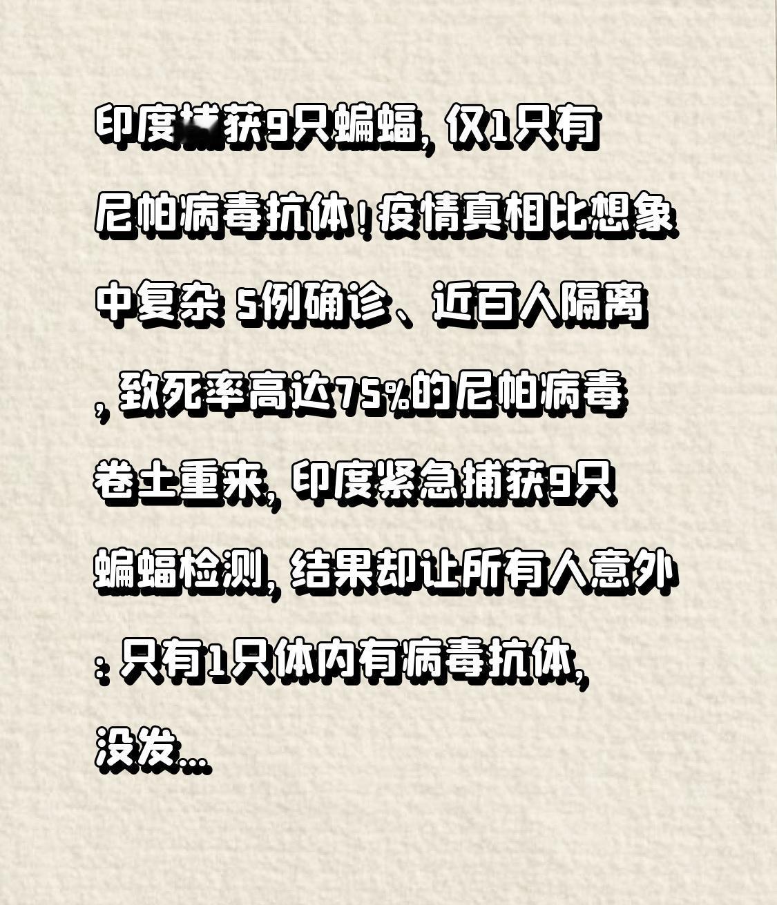 印度捕获9只蝙蝠,仅1只有尼帕病毒抗体!疫情真相比想象中复杂 5例确诊、近百人隔离,致死率高达75%的尼帕病毒卷土重来,印度紧急捕获9只蝙蝠检测,结果却让所有人意外:只有1只体内有病毒抗体,没发现活病毒!这到底是疫情可控的好消息,还是暗藏更大风险? 事情要从印度西孟加拉邦的医院说起。两名护士先后出现高热、意识混乱的症状,确诊感染尼帕病毒,其中一人病情危重。追溯感染源头,调查人员发现,一名55岁去世妇女曾出现类似症状,而这两名护士都参与过她的治疗,更关键的是,这名妇女和女护士都饮用过当地传统饮品——生枣椰汁。 这种在南亚冬季备受追捧的饮品,恰恰是尼帕病毒传播的“高危载体”。果蝠会在采集椰枣汁的容器上留下唾液、尿液,病毒就这样污染了未经煮沸的树液,人饮用后就可能被感染。2007年该地区的尼帕疫情,罪魁祸首也是生枣椰汁。为了找到病毒源头,印度卫生部门联合森林部门,在去世妇女家附近捕获了9只果蝠,可检测结果却出乎意料。 反转来了:9只蝙蝠中,只有1只成年果蝠测出尼帕病毒抗体,说明它曾接触或感染过病毒,但所有蝙蝠的病毒核酸检测都呈阴性,没有发现活病毒。更让人意外的是,24份生枣椰汁样本也全是阴性。这意味着,当前疫情的直接传染源可能不是这批蝙蝠,也不是检测的椰枣汁,病毒源头还在进一步追查中。 但这绝不代表可以放松警惕!虽然蝙蝠中的病毒携带率低,但尼帕病毒的可怕之处在于“隐蔽传播”。果蝠作为天然宿主,能长期携带病毒不发病,通过排泄物持续排毒,堪称“移动病毒库”。而且它的传播途径远比想象中多:除了喝污染的椰枣汁,接触蝙蝠粪便、尿液,甚至处理感染的猪、马等动物,都可能被感染。更危险的是人际传播,虽然一般社交接触传播率低,但在医院、家庭等密切接触场景中,很容易发生交叉感染,此前印度喀拉拉邦的疫情,就出现了多起院内传播案例。 不过也有让人安心的消息:尼帕病毒的人际传播能力远不如新冠,基本再生指数仅0.3左右,3个感染者才可能传染1人,很难造成大规模扩散。我国疾控部门也明确表示,印度此次疫情发生地与我国无领土接壤,对我国影响相对较小,且我国已储备核酸检测试剂盒,各省疾控都具备检测能力,无需过度恐慌。 现在印度已经采取紧急措施,对高风险人群隔离管控,周边泰国、尼泊尔等国也加强了入境筛查。但这场疫情再次敲响警钟:人类与野生动物的距离,就是与病毒的距离。在印度部分地区,野生动物市场、森林旅游等活动增加了人与蝙蝠的接触,给病毒跨物种传播提供了可乘之机。 其实防控尼帕病毒,普通人只要做好这几点就够了:避免接触蝙蝠、家畜等野生动物,不喝生椰枣汁、不吃未煮熟的肉类,勤洗手、保持个人卫生。如果近期从印度回国后出现发热、头痛等症状,一定要及时就医并告知旅行史。 病毒不分国界,疫情防控需要全球携手。印度捕获蝙蝠的检测结果,既让我们看到了疫情可控的希望,也提醒我们不能忽视潜在风险。人与自然和谐共处,才是抵御病毒的根本。你觉得这次尼帕疫情会大规模扩散吗?评论区聊聊你的看法~