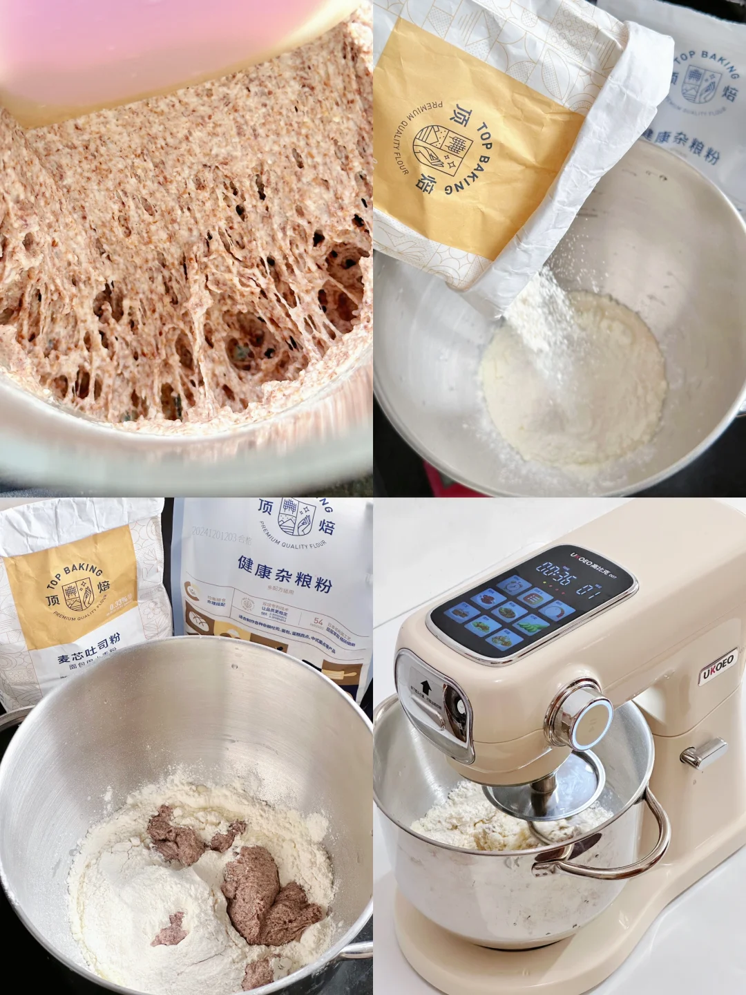 ▫️全麦面筋比较弱,膜不要打的太薄,全麦面团很容易打过,打面的时候需要多观察,面团打过了膨胀力会很弱。