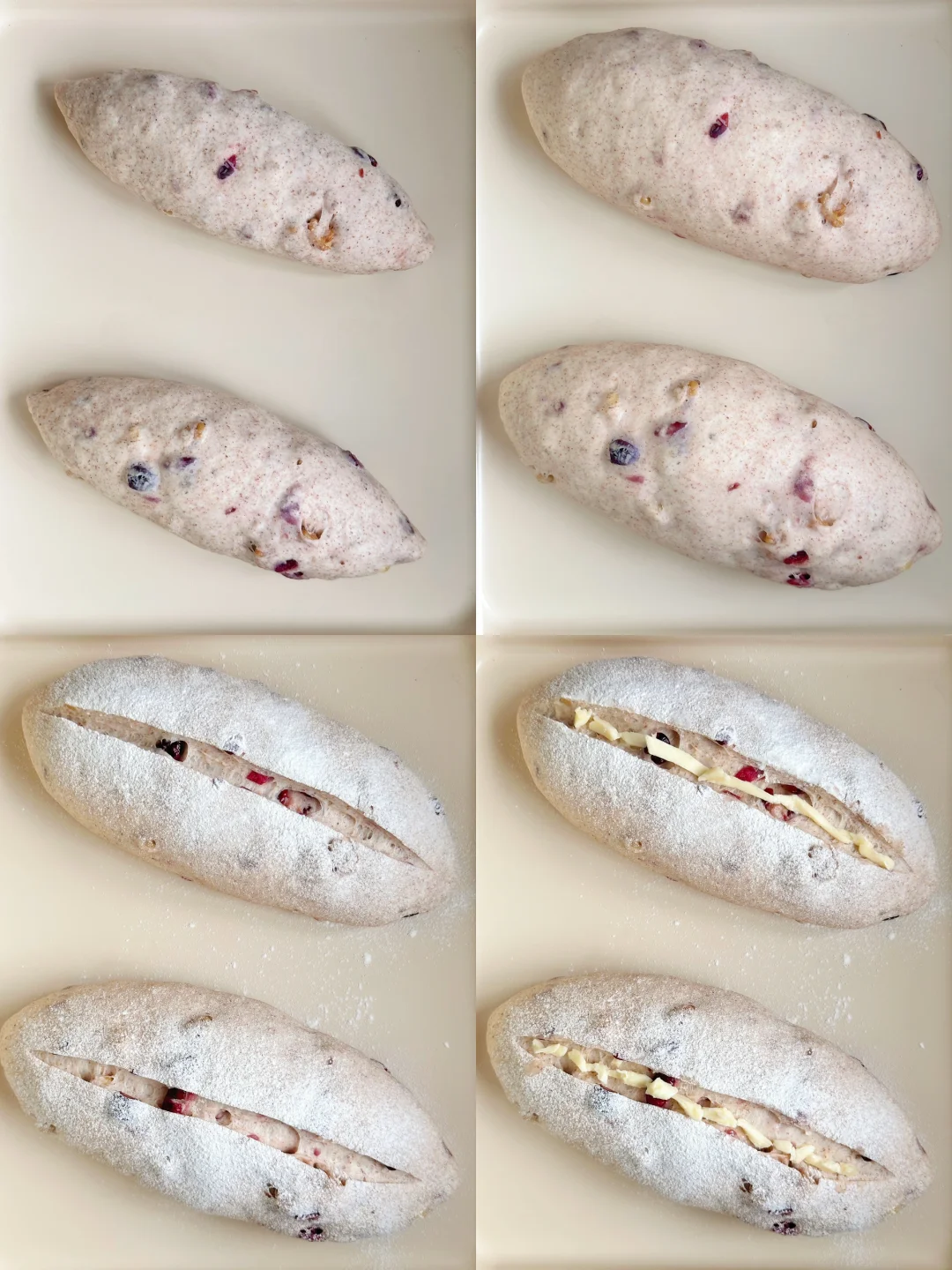 6️⃣做好放入烤盘中,在温度32°C左右,湿度80%发酵至2倍大,筛一层高筋粉,表面割口,挤上软化的黄油