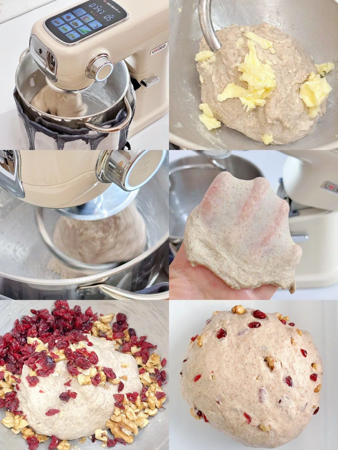 2️⃣除黄油、酵母以外的所有面团材料(包括波兰种)放入高比克007厨师机桶内低速混匀,再转4-5档打至能扯出厚膜,加入黄油和化开的酵母低速混匀,再转4-5档打至能扯出有韧性的薄膜,加入果干坚果碎,低速混匀即可。