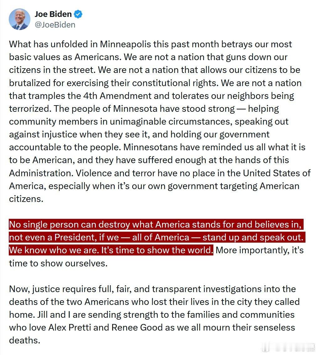 越来越有意思了........似乎民主党抓住了机会!拜登今晚发帖:明尼苏达州的暴力事件“背叛了我们最基本的价值观” 他还呼吁“全美人民”像明尼苏达州人民一样“站出来,大声疾呼”,反对特朗普。海外新鲜事黄媒不会说的真相