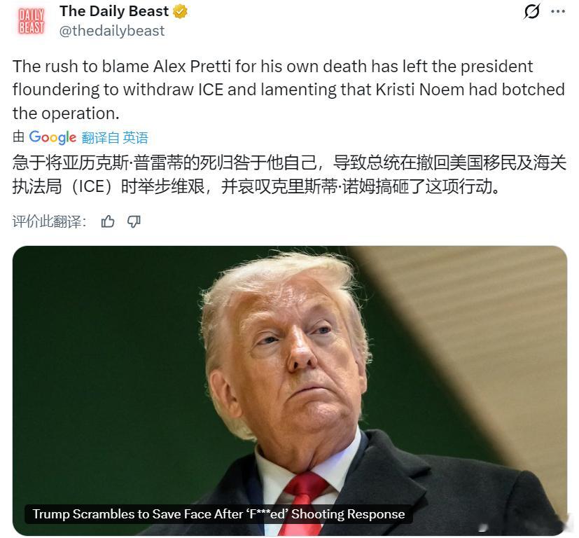 似乎现在已进入甩锅阶段........美媒:人们纷纷将责任归咎于亚历克斯·普雷蒂,致使总统陷入困境,他不得不撤回移民局,并抱怨(国土安全部部长)克里斯蒂·诺姆搞砸了这次行动。海外新鲜事黄媒不会说的真相