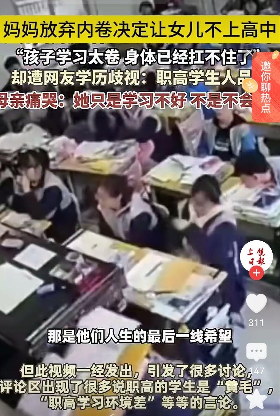 读职高就是“人品差”?江苏妈妈被骂上热搜:我们的教育病了 我在基层工作了二十多年,见过太多为了孩子升学熬红了眼的家长。 最近江苏这位妈妈的哭诉,又一次戳中了无数家庭的痛点。 当孩子的身体被“内卷”拖垮,当“学历歧视”的恶意扑面而来,我们真该停下来想想:读书的意义,到底是为了考高分,还是为了让孩子好好活着? 一、“卷到甲亢”的孩子,比不过一张高中录取通知书? 这位妈妈说,女儿从小体弱,进了重点初中后,每天刷题到凌晨一两点,最后确诊甲亢二级,连体育课都上不了。 当医生明确警告“再这样下去,孩子的身体就彻底垮了”,她才狠下心做出决定:放弃普高,去读职高学护理。 这不是躺平,是一位母亲在“分数”和“生命”之间的本能选择。 可在部分网友眼里,“职高”两个字就等于“没出息”“人品差”。他们用轻飘飘的恶意,否定了一个孩子的未来,也寒了一位母亲的心。 我们总说“健康第一”,但真到了现实里,多少人还是把“学历”看得比孩子的命还重? 二、读职高,从来不是“差生”的归宿 很多人对职高的偏见,还停留在“混日子”的刻板印象里。但如今的职业教育早已今非昔比: 优质职高的护理、数控、电商等专业,就业率比不少普通本科还高; 职教高考的通道已经打通,职高生一样能考本科、读研究生; 技术型人才的社会需求越来越大,有一技之长的孩子,未来未必比挤过独木桥的“学霸”差。 就像这位妈妈选的护理专业,既能让孩子学到安身立命的本事,又能避开高压的应试环境,何尝不是另一种成功? 真正的教育,从来不是“千军万马过独木桥”,而是让每个孩子都能找到适合自己的赛道。 三、比起学历歧视,更该反思的是“唯分数论”的执念 这场争议的背后,是整个社会对“学历”的病态崇拜。我们习惯用“考上什么学校”定义孩子的人生,却忘了教育的本质是“育人”,不是“育分”。 当“内卷”从校园蔓延到家庭,当孩子的身心健康被当成“代价”,我们亲手打造的“教育军备竞赛”,最终只会伤害每一个参与者。 就像作家周国平说的:“教育的本质是一棵树摇动另一棵树,一朵云推动另一朵云,一个灵魂唤醒另一个灵魂。” 真正的好教育,不是逼孩子成为“别人眼中的优秀”,而是让他们成为“更好的自己”。 如果你的孩子面临“身体垮掉”和“读职高”的选择,你会怎么做?欢迎在评论区聊聊你的看法。 (内容取材网络) 点亮〔收藏和赞〕让健康和爱都流向你