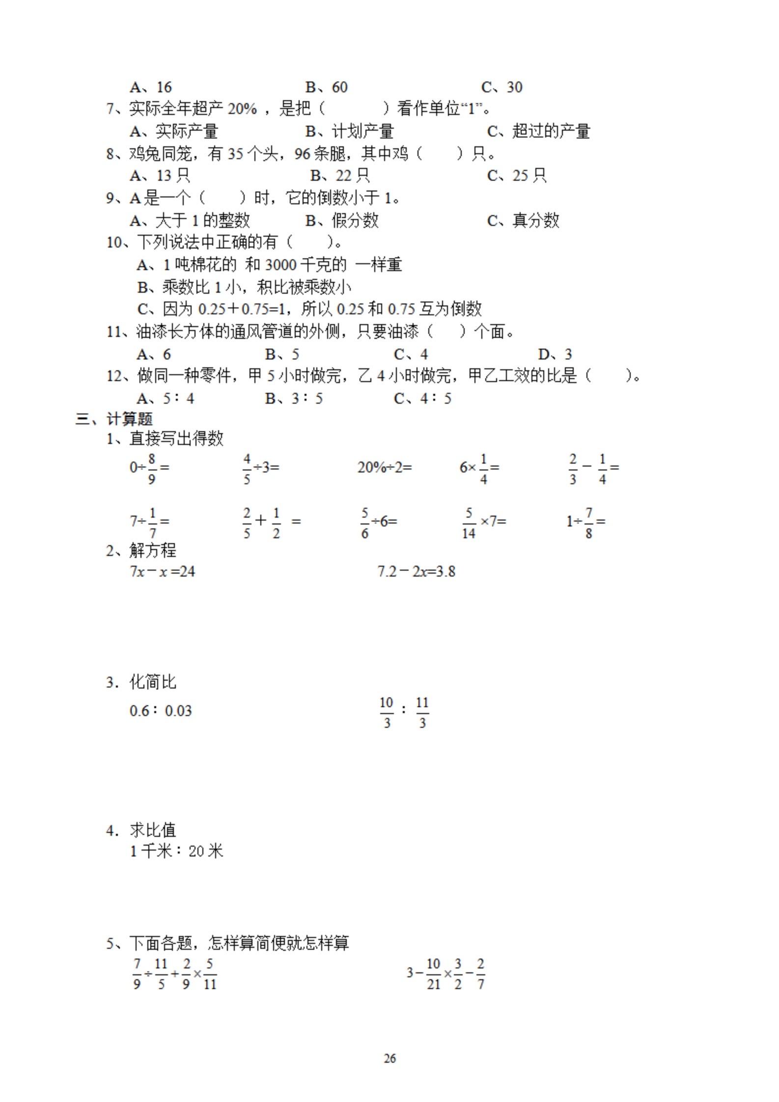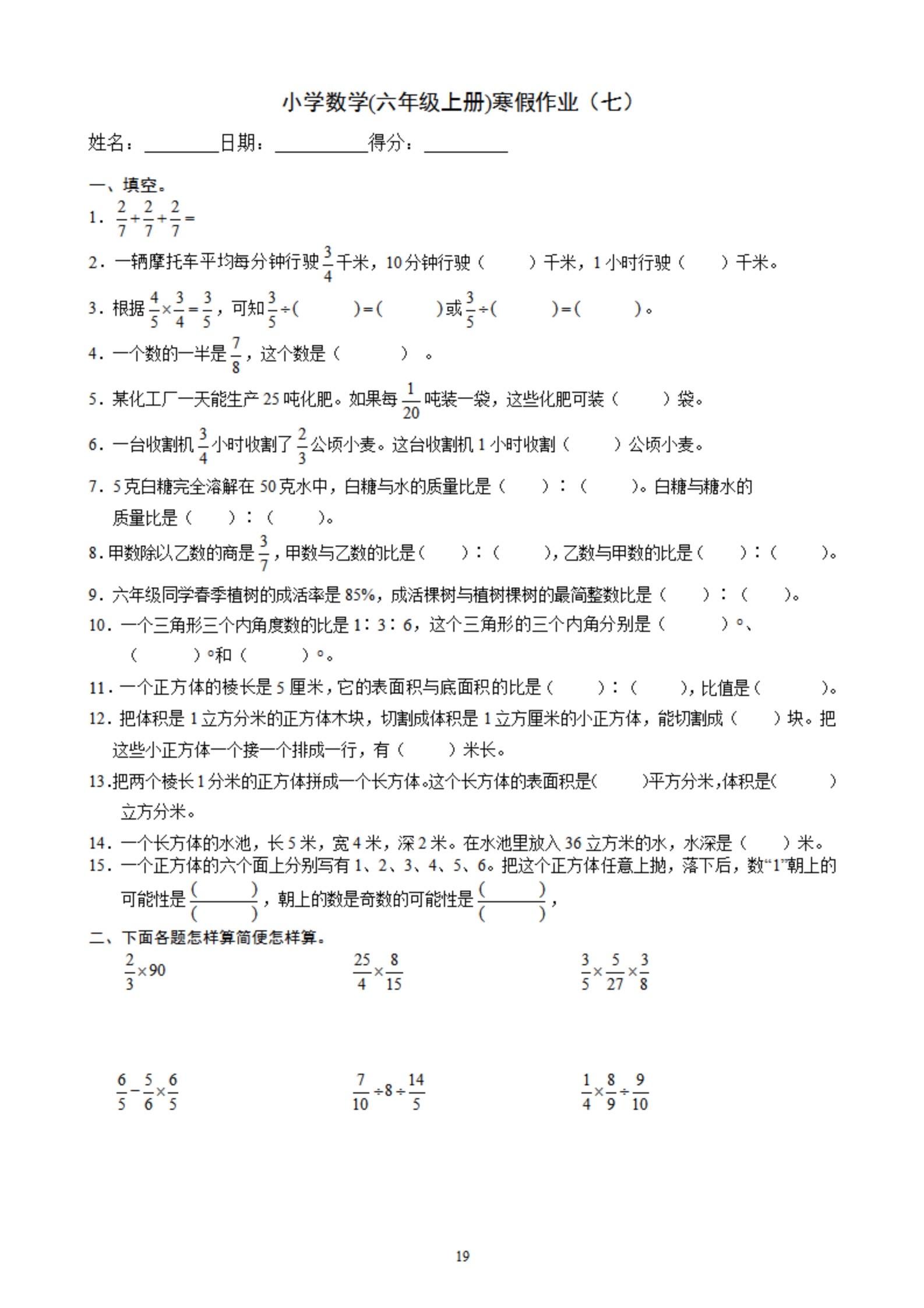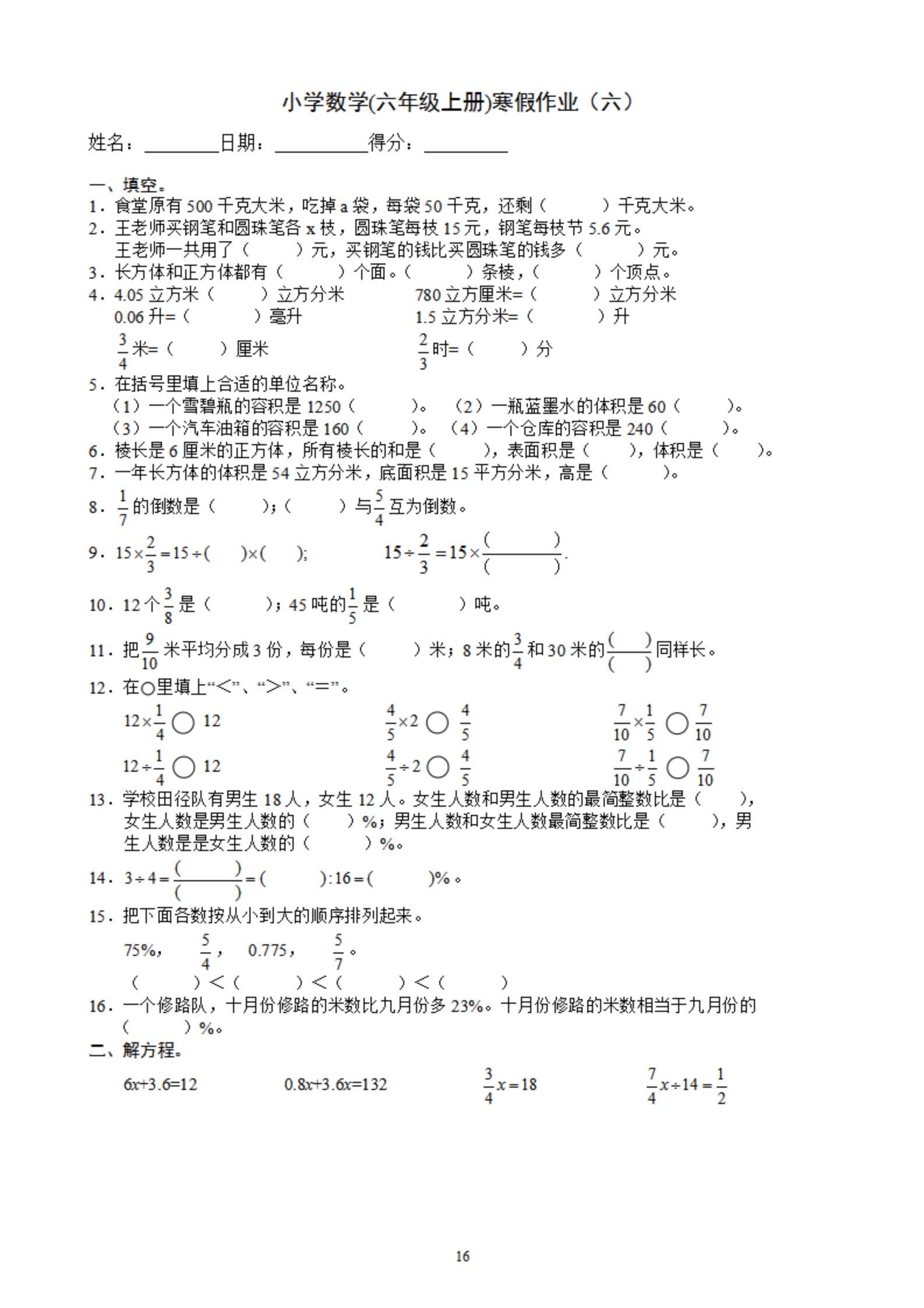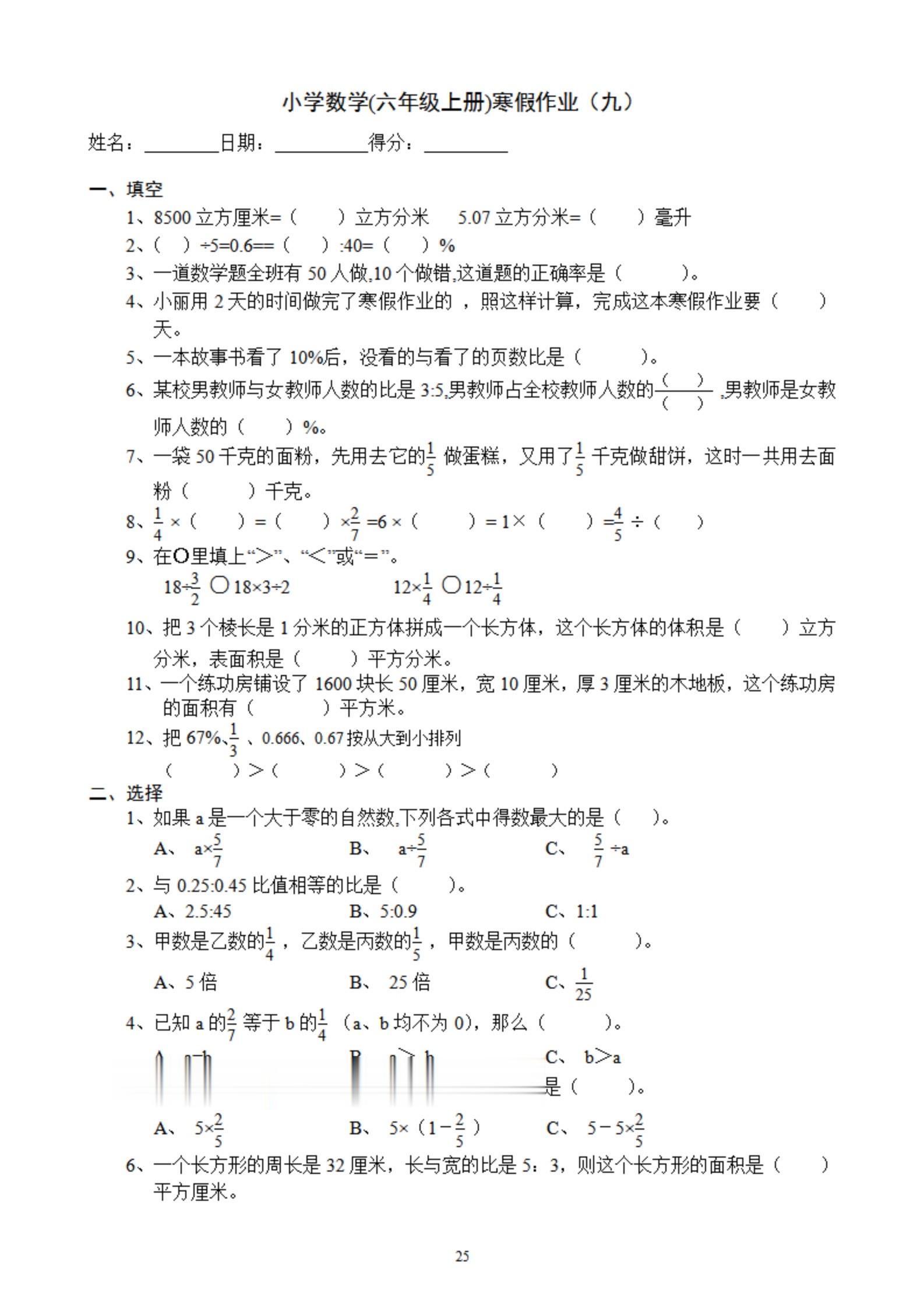 2026年春小学六年级数学寒假作业。 有需要可以自行下载打印出来。 ...
