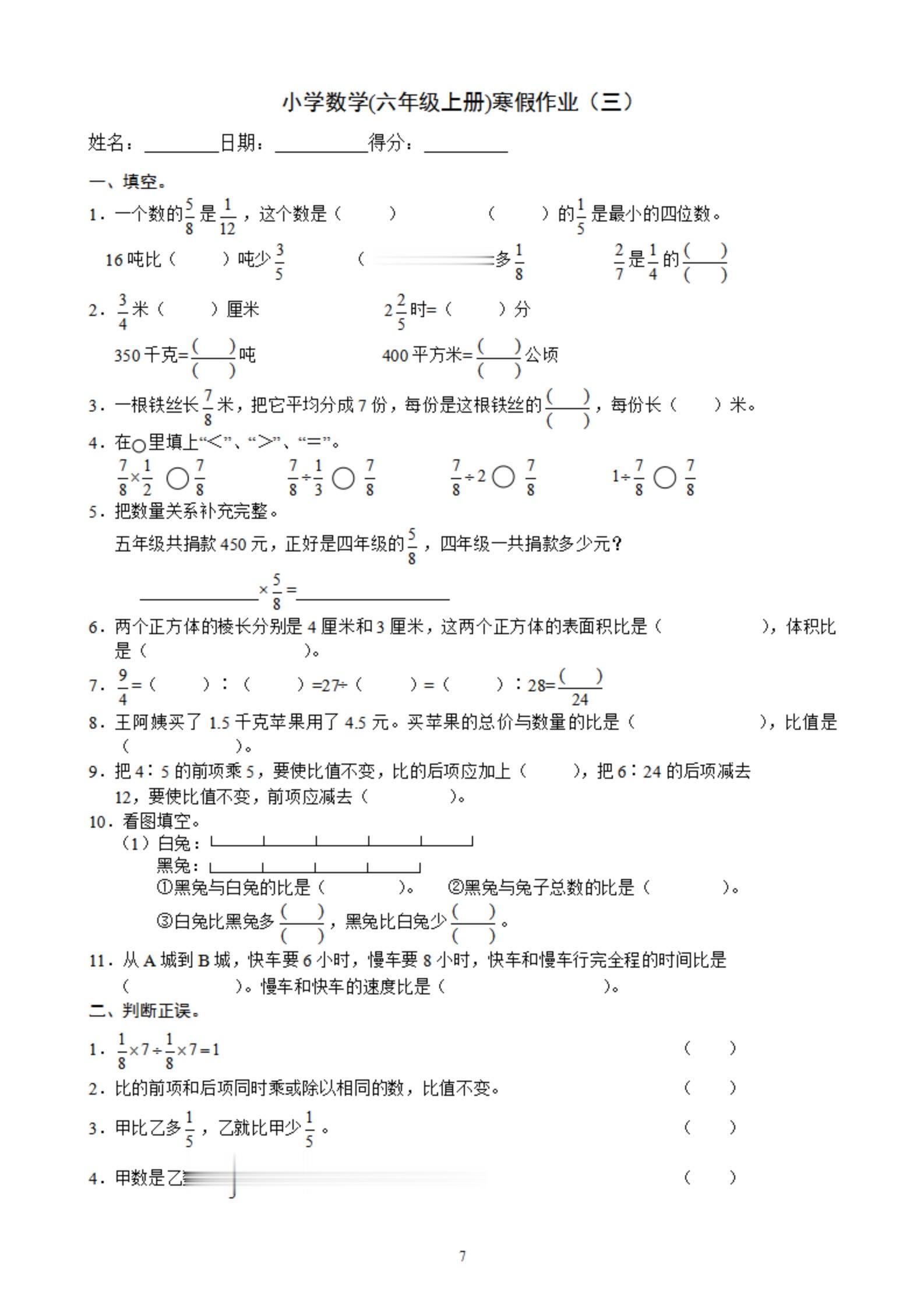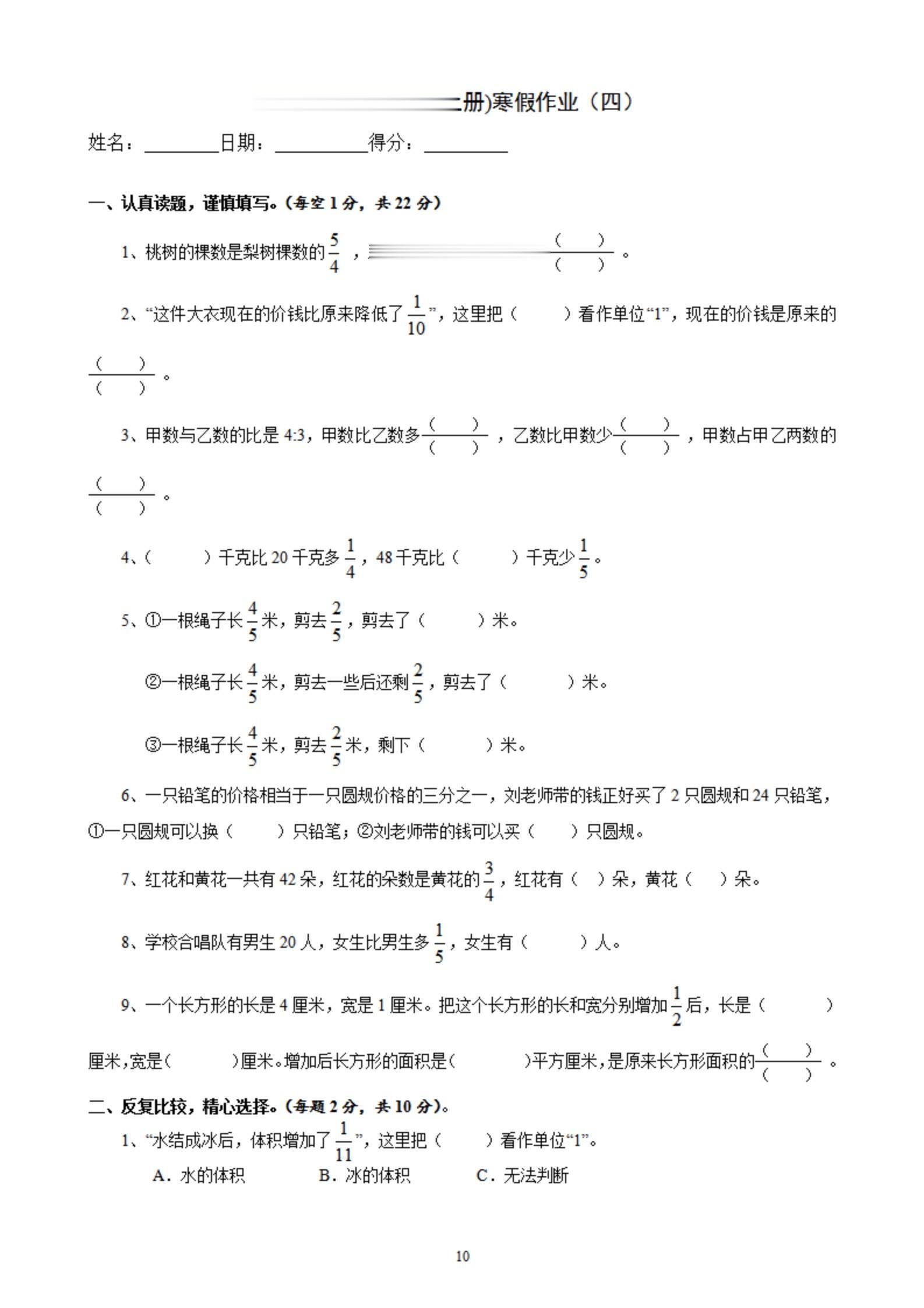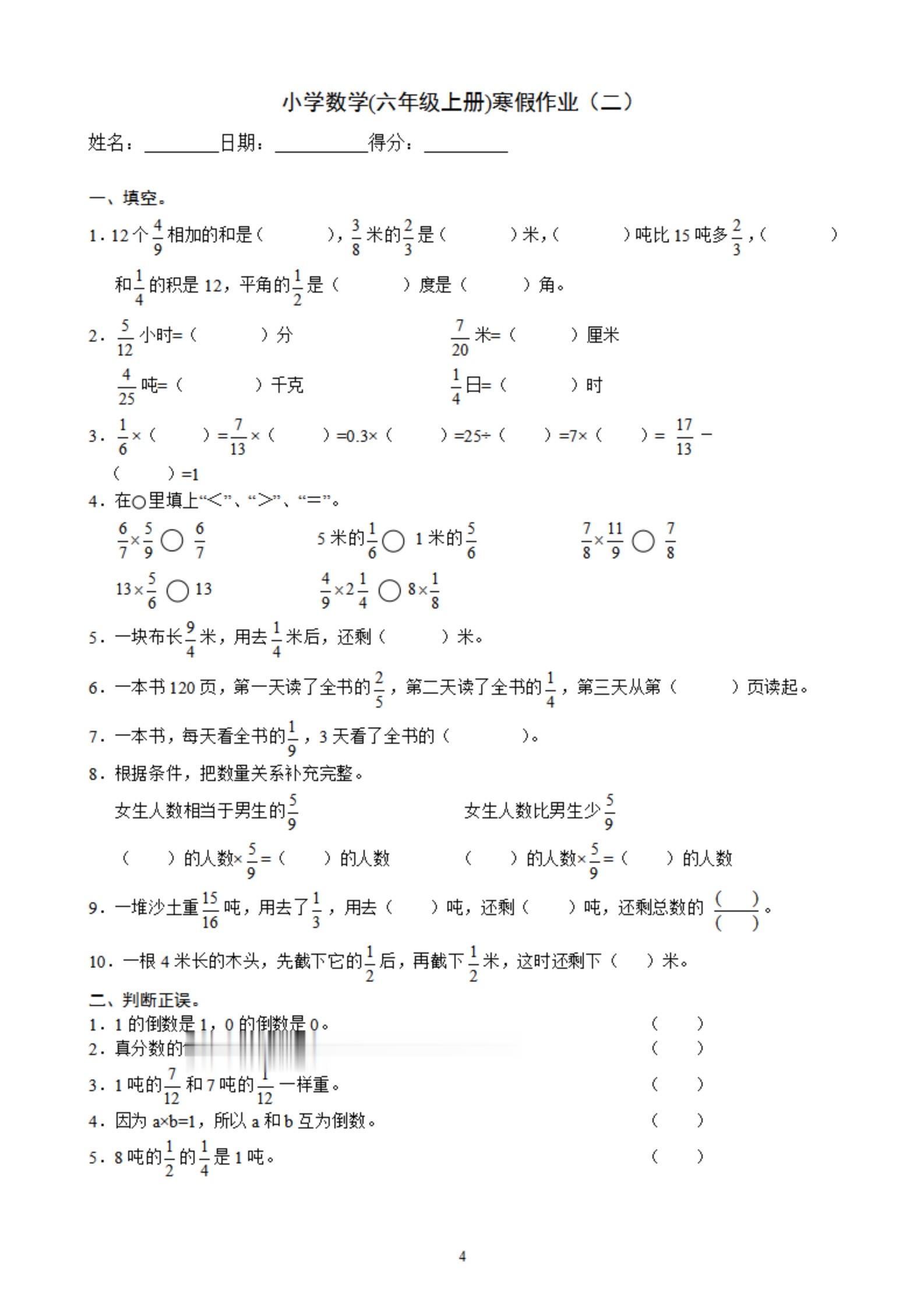 2026年春小学六年级数学寒假作业。 有需要可以自行下载打印出来。 ...