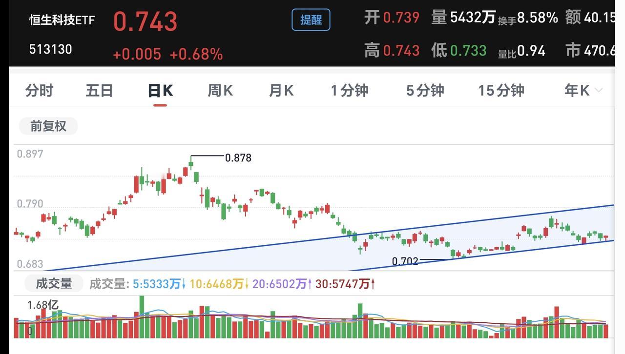 基金:恒生科技指数应该怎么办 恒生科技指数昨天是上涨的,上涨了0.50%,收盘的时候5天线位置是5757点,收盘点位5754点,收在5天线之下,连续2个交易日收在5天线之下,只要不站上5天线,就不能说恒生科技指数已经走强。 看下面的截图2,这是恒生科技指数日线级别短期上涨通道,昨天和前天都是下跌到上涨通道下轨线附近反弹,近期要观察会不会跌破这个上涨通道的下轨线,如果跌破这个上涨通道的下轨线,就说明这个日线级别的短期上涨趋势被破坏。 看下面的截图3,这是恒生科技指数周K线图,现在的位置处于这个上涨通道中,距离上涨通道的下轨线比较近,近期也是观察是跌破这个上涨通道的下轨线,还是在这个位置进行反弹。 恒生科技指数短线持有者的持有条件是日线级别上涨通道的下轨线,长线持有者的持有条件是周线级别上涨通道的下轨线。只要不跌破这两个上涨通道的下轨线,短线和长线的持有者都可以继续持有。 大家帮忙评论,点赞,转发和分享,谢谢大家的支持。