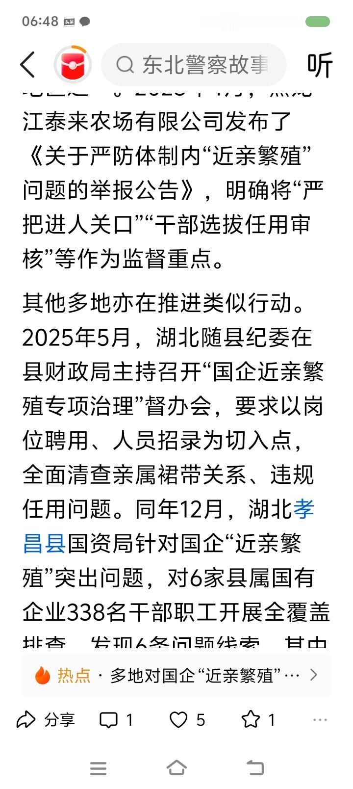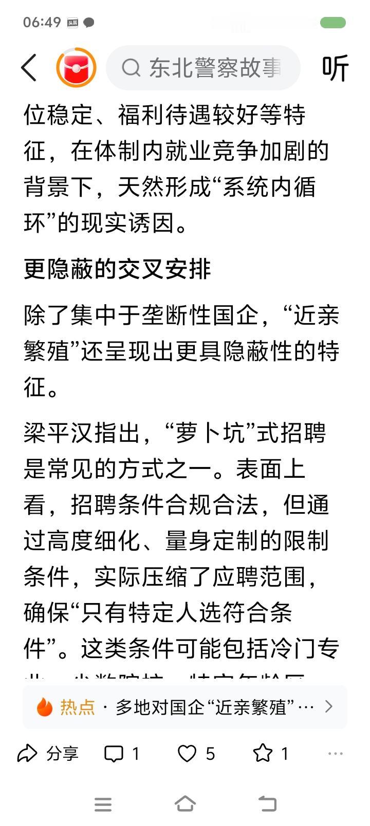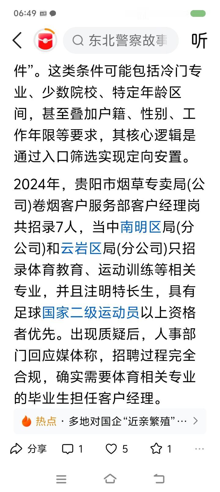 挖出企事业单位“近亲繁殖”的根源—— 据报道,一些地方开始整顿金融、电力、烟草、石油等领域的“近亲繁殖”问题。“近亲繁殖”不仅是公权私用、违背公平,而且会增加国有资产流失的风险。一些企业在招聘条件上就为特定人群设置,比如在专业、院校、户籍、性别、任职年限等方面压缩应聘范围。2024年,贵州某地烟草招客户经理,条件是:体育教育、运动训练专业;特长生、足球国家二级运动员优先。外界质疑后,人事部门仍宣称招聘过程合规。 点评: “近亲繁殖”最严重的危害是固化阶层,阻碍社会良性循环,动摇人民群众对社会的信心。任贤使能,是中国历史的一大传统。“上品无寒门,下品天士族”,什么后果? 另外,警惕一些人形成家族势力、利益链,利用祠堂、宗教、民间信仰等干扰地方事务。