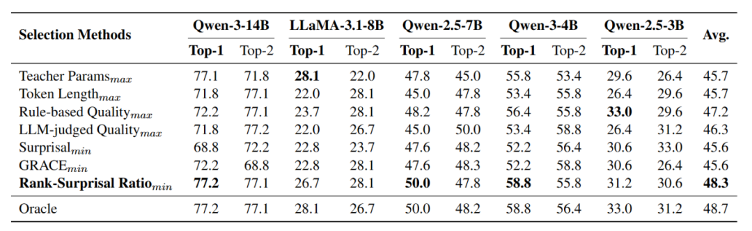 实验结果表明,基于Rank-SurprisalRatio筛选得到的数据,在不同student模型上训练后均取得了最优的推理性能,优于其它方法。