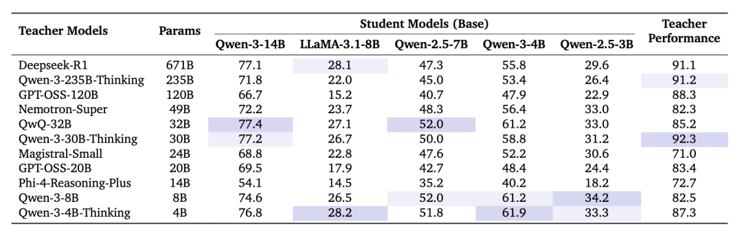 在这篇工作中,作者系统性地构建了11个teacher(教师模型)×5个student(学生模型)的蒸馏实验,覆盖从4B到671B的主流推理模型。结果显示: