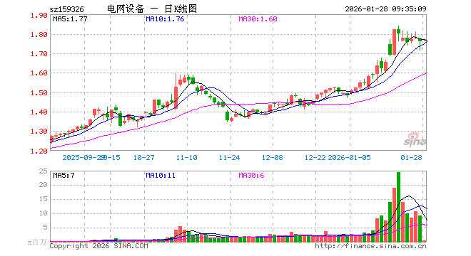 1月28日,电网设备ETF(159326)开盘涨0.51%,报1.769元。电网设备ETF(159326)重仓股方面,特变电工开盘涨0.04%,思源电气涨0.04%,国电南瑞涨0.35%,中天科技涨5.49%,亨通光电涨6.69%,宏发股份涨0.55%,正泰电器涨0.03%,金盘科技跌0.79%,东方电缆涨0.13%,中国西电跌0.06%。