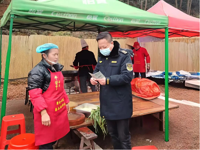 宴席举办当日,执法人员提前进驻现场,对食品原材料进货渠道及台账管理情况、从业人员健康证明是否齐全且在有效期内、后厨加工制作环境、操作流程、食品储存条件及冷藏冷冻设施运行等食品安全关键环节开展全面检查,切实落实生熟分开、规范操作等要求,督促餐饮单位严格落实食品留样制度,对当餐供应的重点菜品按要求进行留样保存。同时执法人员还随机抽取部分菜品,现场开展食品安全快速检测,及时排查食品安全风险隐患。