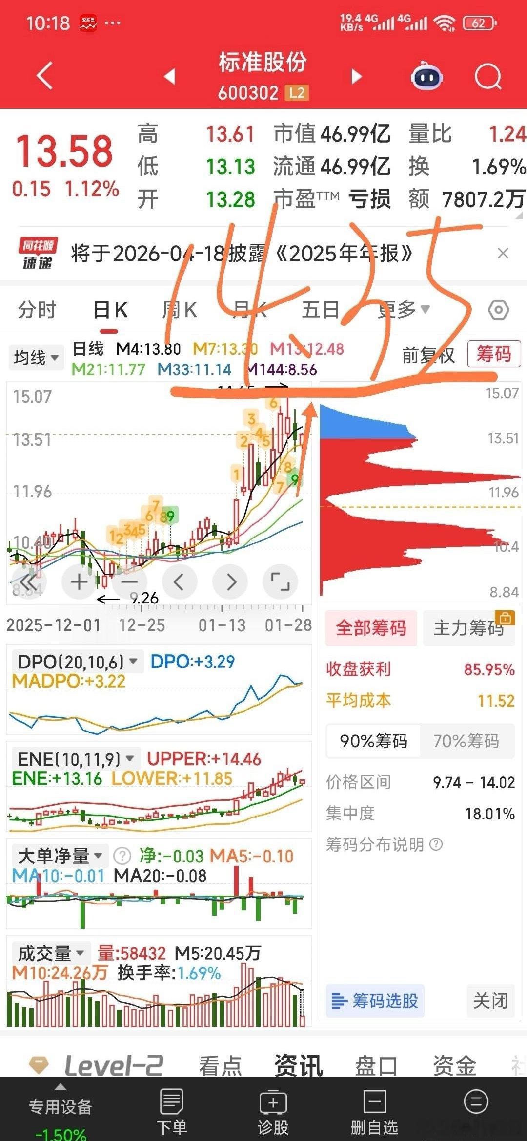 再给标准股份画个上冲14.35元的分时路线图。听话吧。下周就不用画了,只放梯子作