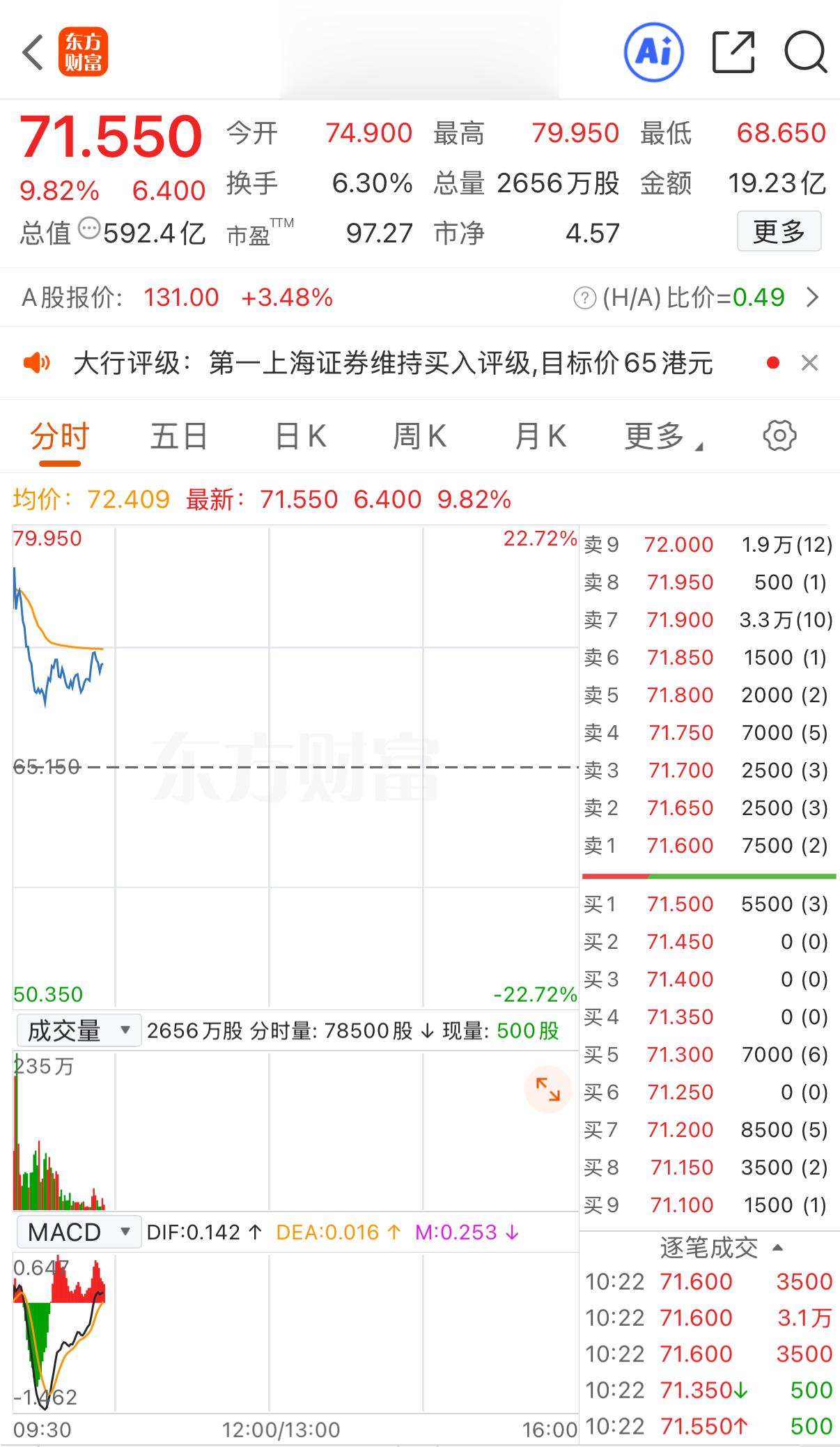 上证报中国证券网讯(记者何治民)1月28日,长飞光纤光缆冲高回落,盘中一度涨超22%,截至10时22分,该股涨9.82%,报71.55港元/股。