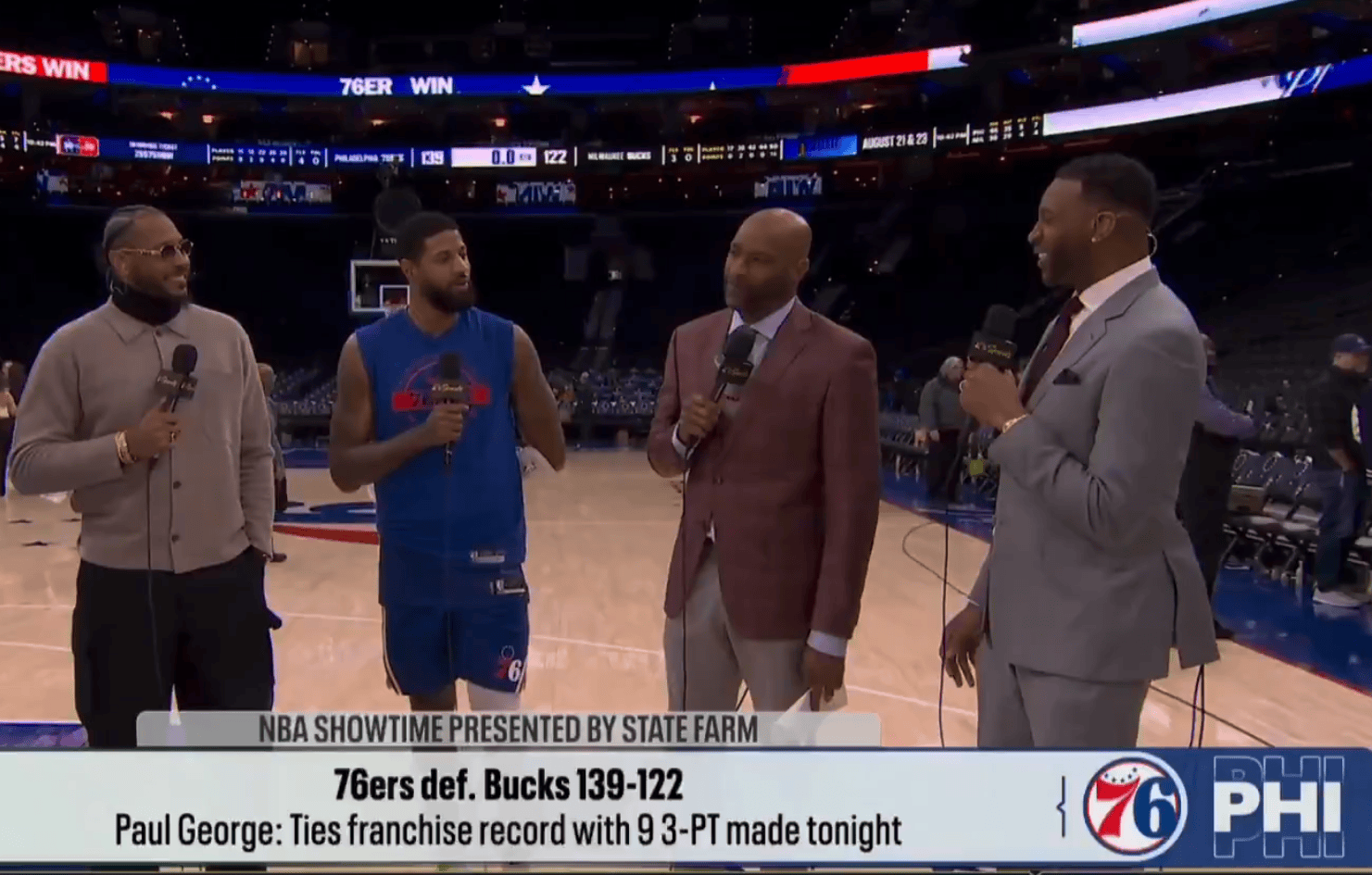 赛后保罗-乔治接受本场解说嘉宾卡梅罗-安东尼、文斯-卡特、麦迪三人的联合采访。