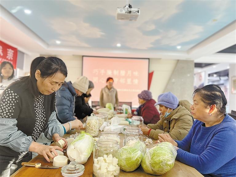 社区居民分工协作,边忙碌边交流腌制“小秘方”,在实践中感受传统民俗魅力。