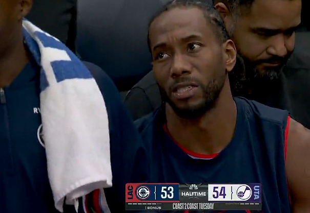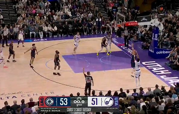 第二节比赛中,埃斯-贝利压哨三分投进,爵士半场54-53领先快船。