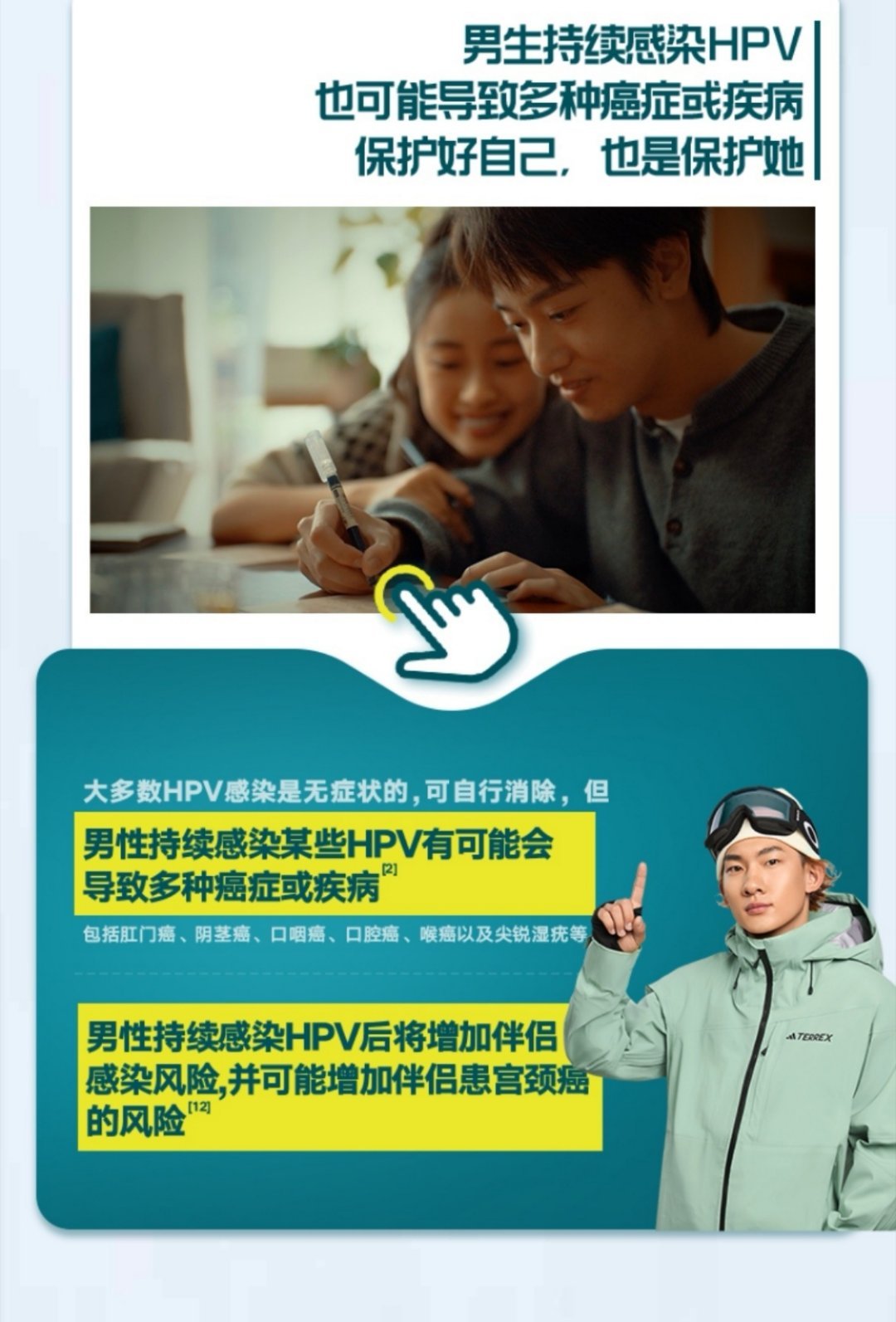 男生可以接种HPV疫苗和苏翊鸣一起守护健康和苏翊鸣一起,以专业态度诠释健康守护!正如他在雪道上的每一次腾空都需周全防护,健康备战,预防为先!HPV(人类乳头瘤病毒)感染风险不容忽视,而HPV疫苗是科学构筑的坚实防线。年轻男性是HPV感染的高风险人群,18~24岁和40~44岁为感染高峰,防重于治!HPV感染后大多可被免疫机制自行清除,但是男性持续感染HPV可导致多种疾病,接种HPV疫苗,是预防HPV相关疾病的有效方法之一,而保持清洁卫生、避免不洁性交、使用避孕套等日常防护措施也很重要!苏翊鸣以极致专注挑战极限,我们亦需以同样态度守护健康。参与HPV防护,是对未来的坚实投资。让我们与苏翊鸣同行,以科学为盾,筑牢健康根基,为人生每个舞台蓄满能量!