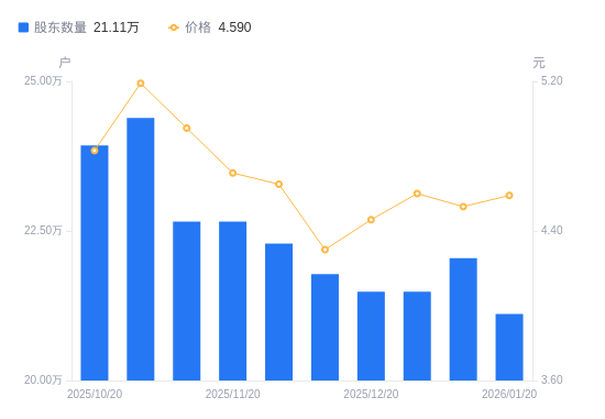 近一年(2025年1月27日至2026年1月20日),跨境通A股股东户数从23.21万户,减低至21.11万户,降幅9.04%,区间股价下跌2.55%。