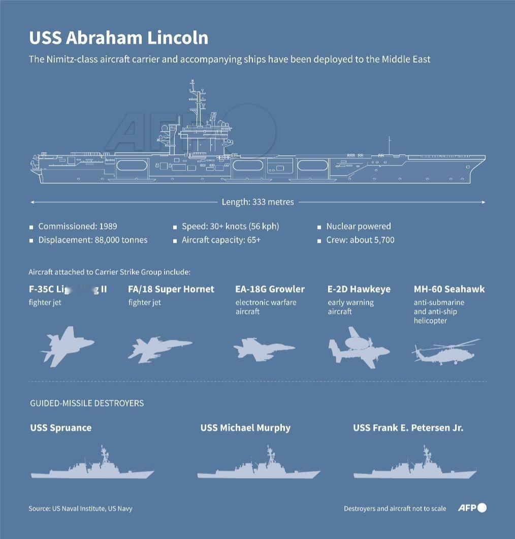 法新社公布已抵达中东的亚伯拉罕·林肯号航空母舰及其随行海军舰艇的信息图!并表示特朗普说伊朗希望谈判!其中有三艘战舰护卫:分别是阿利·伯克级的斯普鲁恩斯号、迈克尔·墨菲号,还有那艘弗兰克·E·彼得森号导弹驱逐舰。亚伯拉罕.林肯号航空母舰长度:333米服役时间:1989年 速度:30节以上(56公里/小时) 核动力 排水量:88,000吨 飞机容量:65架以上 船员:约5,700人 航母战斗群所搭载的飞机包括:F-35C闪电II型 FA/18超级大黄蜂战斗机 EA-18G鹰眼 E-2D鹰眼 MH-60 海鹰直升机 法新社消息:周二,由一艘航空母舰率领的美国海军打击部队出现在中东水域,伊朗发誓要反击任何袭击,唐纳德·特朗普总统表示,他相信伊朗伊斯兰共和国仍然希望进行谈判。 ★:伊朗是贵还是和,反正都得付出代价,要不美国不会轻易放弃打击!伊朗回应美军航母打击群就位伊朗称战争不会后退一毫米美伊对峙