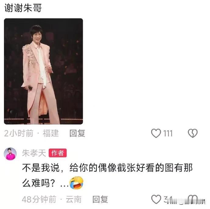 朱孝天又破防了? 12月20日,一则“朱孝天疑似内涵阿信”的话题,引起了关注和热议。 原来,有网友跑到朱孝天的评论区,晒了一张阿信在演唱会舞台上的照片,并配文说:“谢谢朱哥”。 照片中,阿信穿着一身浅粉色的着装,手拿话筒,看着台下的观众,笑容灿烂。 今年刚满50岁的他,身材依旧保持得很好,没有发福。 这是阿信与言承旭、周渝民、吴建豪一起开的演唱会,朱孝天因种种原因,缺席了这次F4的演唱会。 看着网友晒阿信演唱会上的照片,并感谢自己。 朱孝天回复道:“不是我说,给你偶像截张好看的图有那么难吗?” 朱孝天的这个反应,有人觉得他这是又破防了,阴阳怪气的,格局太小。 不过,也有人觉得是网友先跑去招惹朱孝天的,人家也只是正常回应罢了。 朱孝天自从在直播间自曝删了明道、贾玲、F4其他三位成员的联系方式。 还说了一些让网友们觉得低情商的话后,现在的他几乎没有什么路人缘口碑了。 朱孝天曾说,他在F4里不开心。 这次F4的演唱会不带他变成了“F3+阿信”,或许这也是如了朱孝天的愿了吧! 对此,你们怎么看?