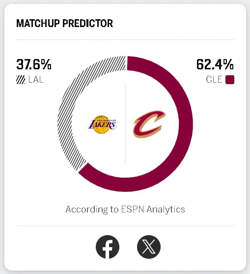 湖人明日客场挑战骑士,里夫斯不复出,ESPN给出湖人胜率高达37.6%湖人vs骑士