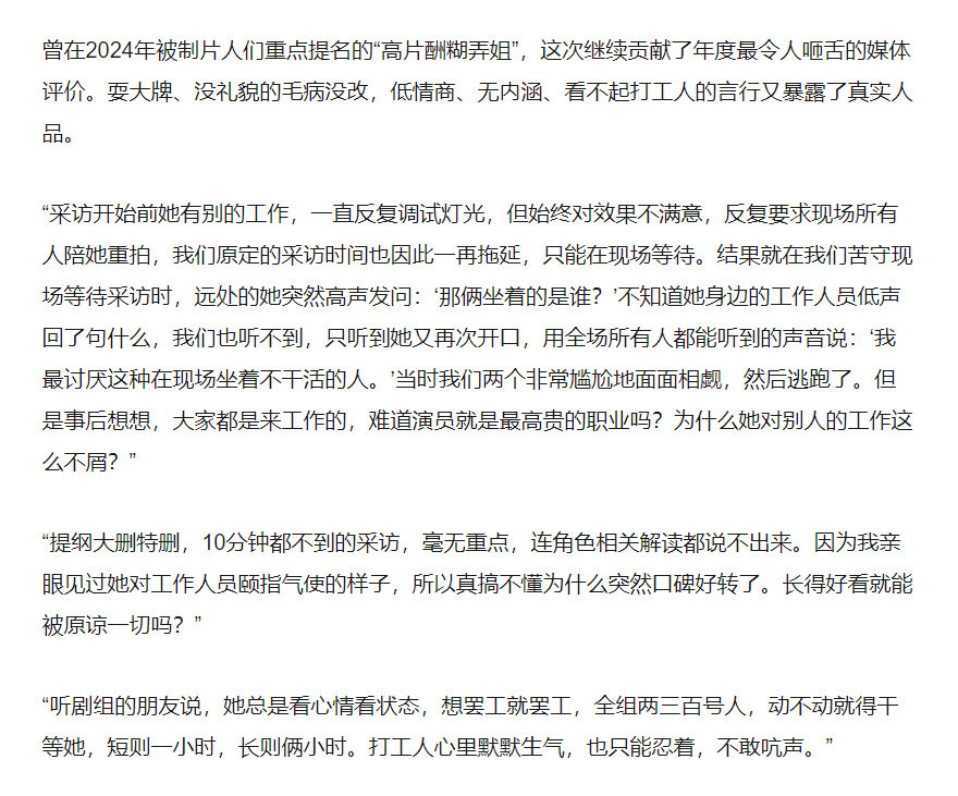 高片酬糊弄姐 傲慢罢工姐 媒体眼中的某位位“高片酬糊弄姐”,耍大牌、没礼貌的毛病没改,低情商、无内涵、看不起打工人的言行又暴露了真实人品,又成了“傲慢罢工姐”。“提纲大删特删,10分钟都不到的采访,毫无重点,连角色相关解读都说不出来。因为我亲眼见过她对工作人员颐指气使的样子,所以真搞不懂为什么突然口碑好转了。长得好看就能被原谅一切吗?”“听剧组的朋友说,她总是看心情看状态,想罢工就罢工,全组两三百号人,动不动就得干等她,短则一小时,长则俩小时。打工人心里默默生气,也只能忍着,不敢吭声。” 说的是谁啊?